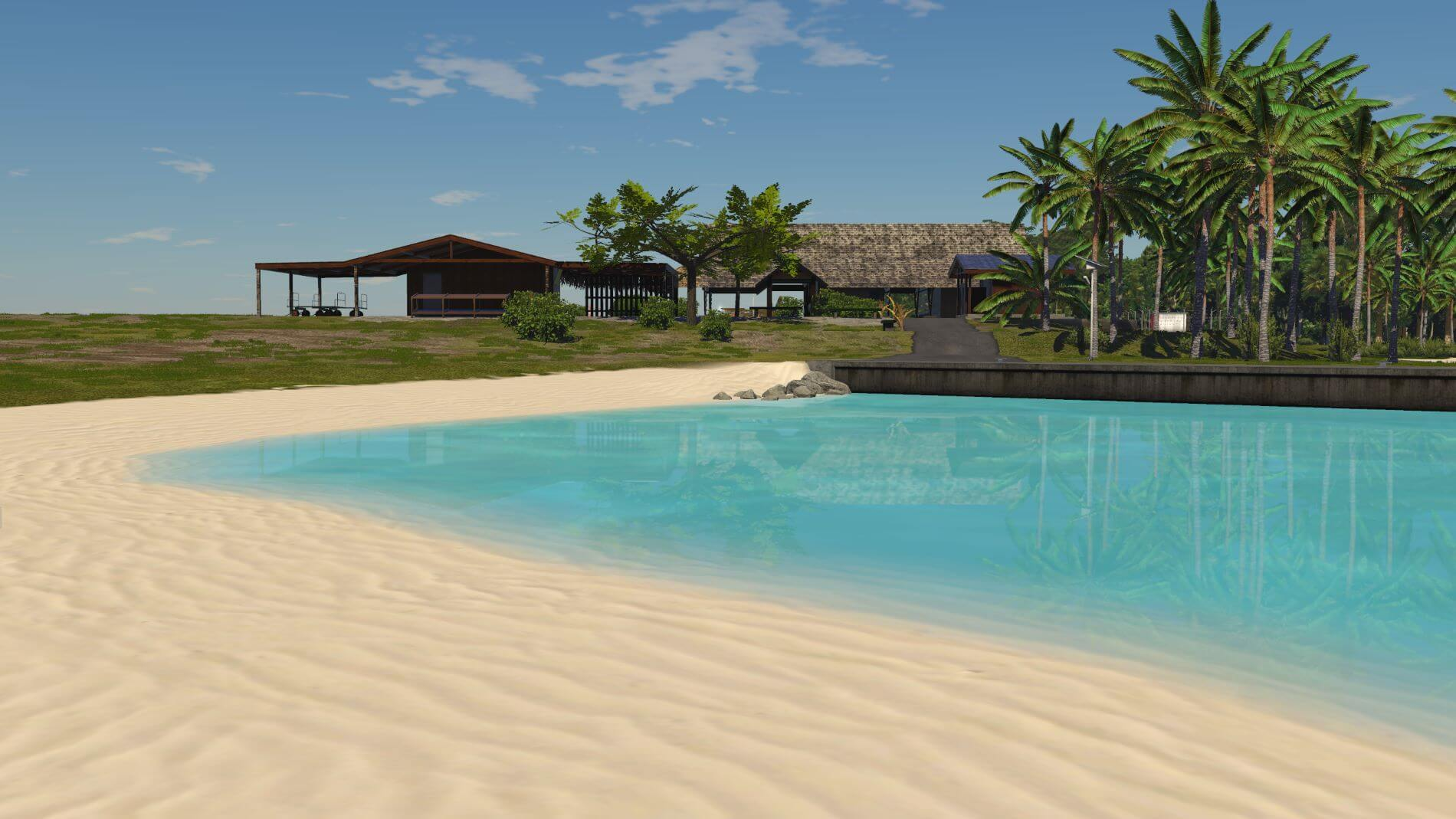 Zum Abschluss werfen wir einen kurzen Blick auf das Dorf und die Autogen-Gebäude. Der Hafen von Maupiti ist mit einer großen Betonfläche und einigen Gebäuden in der Mitte modelliert. Der erste Eindruck ist, dass es sich für die Insel etwas groß anfühlt. Eine Mischung aus Bodentexturen würde diesen Eindruck mildern und eine natürlichere Verschmelzung mit dem Rest der Insel ermöglichen. Auch eine Begrünung und Verbindungswege zwischen den Gebäuden würden zur Auflockerung dieser flachen Fläche beitragen.
