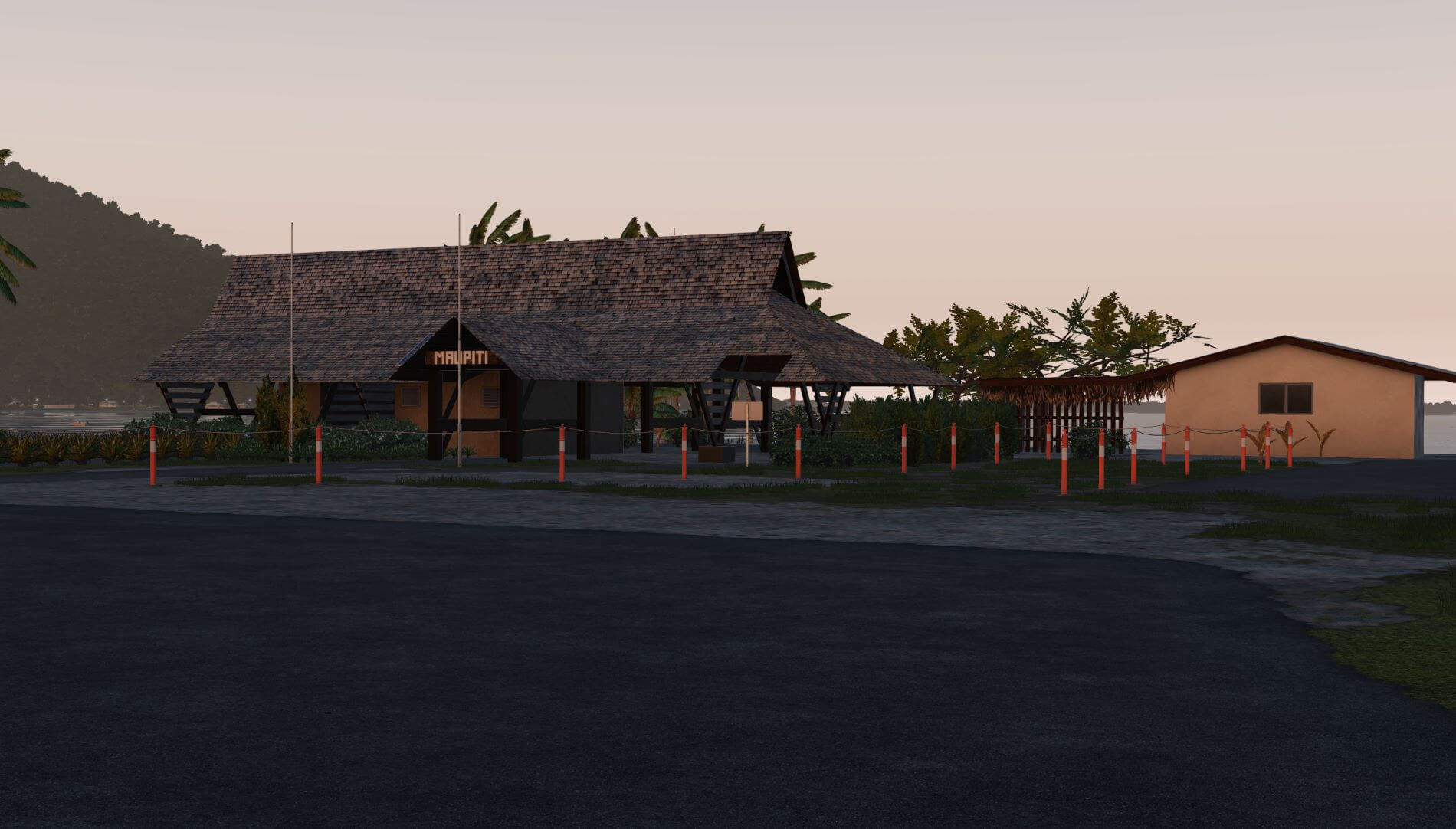 Raiatea ist ein Flugplatz mit nur einer Landebahn. Die Start- und Landebahnen haben die Nummern 07 und 25 und sind 4593 Fuß lang und 98 Fuß breit. Laut aktueller Tabelle ist die Beleuchtung auf RL- und PAPI-L 3°-Leuchten beschränkt. Kurioserweise zeigt Google Earth eine Start- und Landebahn und ein Vorfeld, die dunkel und neu gepflastert erscheinen, wie es hier für uns modelliert wird, während die Kartennotiz Piloten vor einer stark beschädigten Fahrbahn mit losem Kies warnt. Darüber müssen wir uns keine Sorgen machen, wie der ausgezeichnete Zustand der Start- und Landebahn und des Vorfelds, die wir vor uns haben, beweist. Die Markierungen sind klar und genau. Wenn Sie über das SAM-Plugin verfügen, werden Sie hier wie in Bora Bora von Air Marshalls begrüßt, während Sie zu Ihrem zugewiesenen Platz rollen. Es gibt drei Vorfeldstarts, zwei Helikopterstarts und zwei Starts vor dem Aeroclub-Hangar. Während die Start- und Landebahn kürzer als NTTB ist, ist die Anzahl der Gebäude, aus denen der Flughafen besteht, größer.