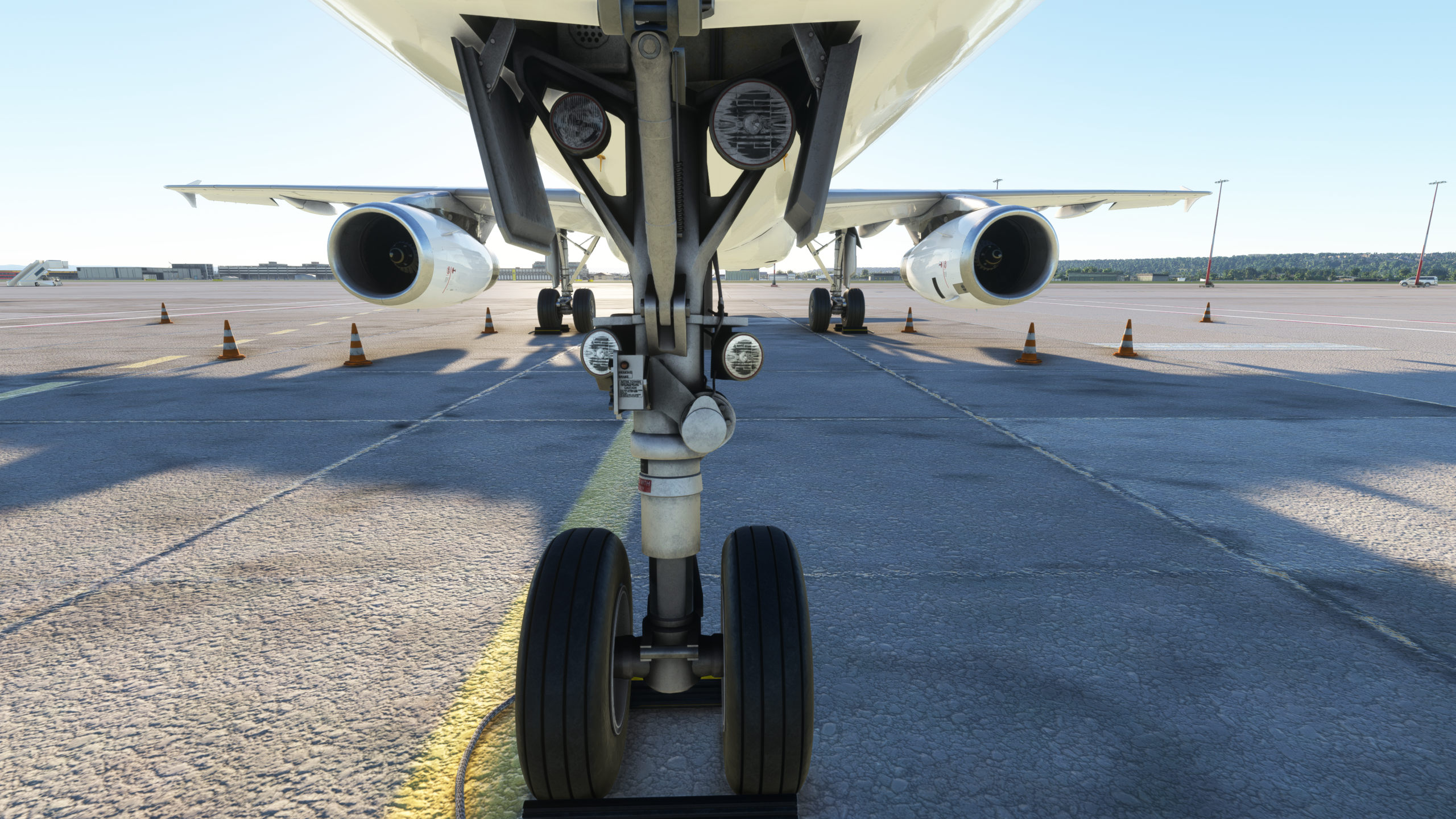 Ich beginne mit einer Außeninspektion des FSL A321ceo und widme mich zunächst dem Bugfahrwerk. Auf den ersten Blick fällt sofort auf, dass alle Details sehr sorgfältig und präzise modelliert wurden. Die Form und Struktur lassen keine Wünsche offen, und es gibt keinen Grund zur Beanstandung, was die grundlegende Darstellung betrifft. Doch bei näherer Betrachtung fällt mir auf, dass etwas fehlt – und zwar die passende bzw. realitätsnahe Texturierung. Diese wirkt auf mich etwas zu steril und beinahe klinisch. Wo die Texturen vielleicht etwas mehr „Leben“ und Charakter vertragen könnten, ist alles sehr sauber und glatt. Ein Vergleich mit dem Fenix zeigt, wie man dieses Thema auf ein neues Level heben kann: