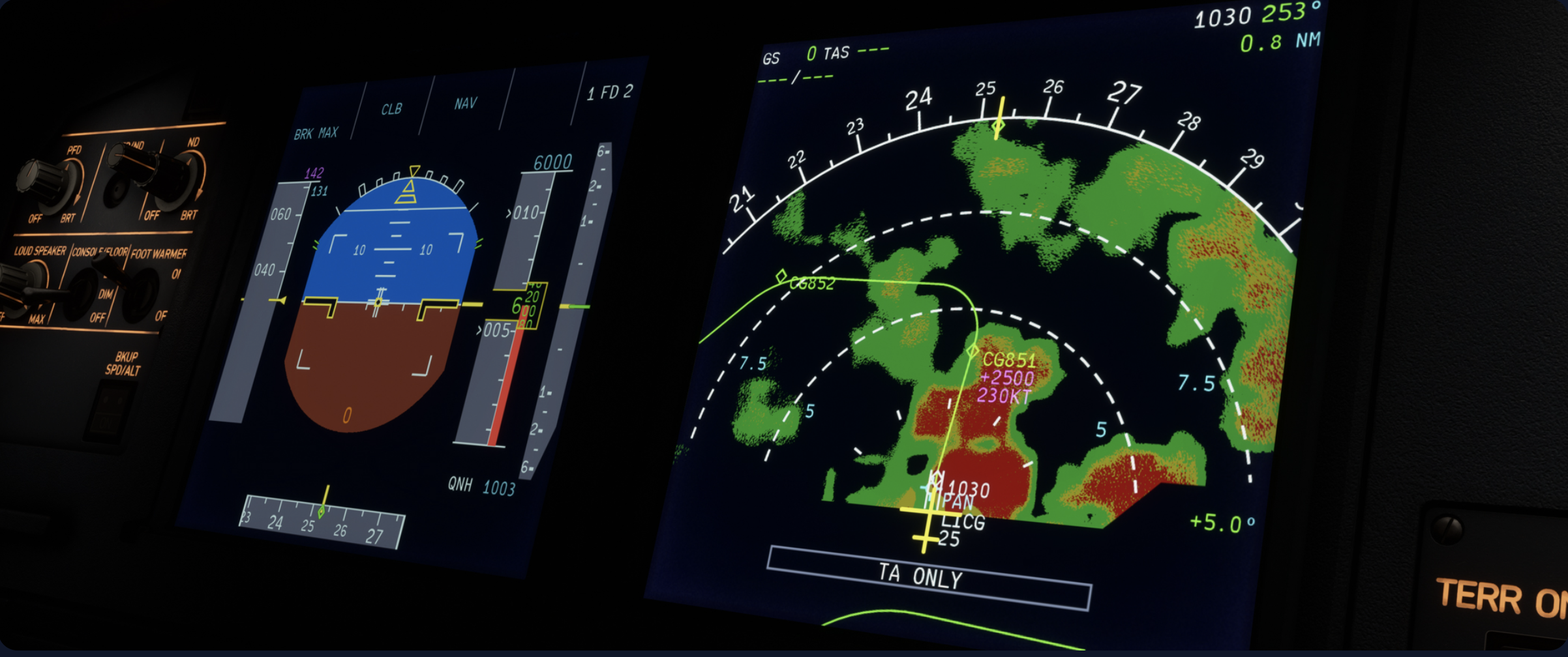 Durch ein kürzlich erschienenes Update (wir berichten) wurde auch ein Wetterradar, genauer gesagt eine Nachbildung des Rockwell Collins WXR-2100, integriert. Das ist durchaus ein großer Pluspunkt gegenüber dem Fenix, der momentan gar kein Wetterradar besitzt.