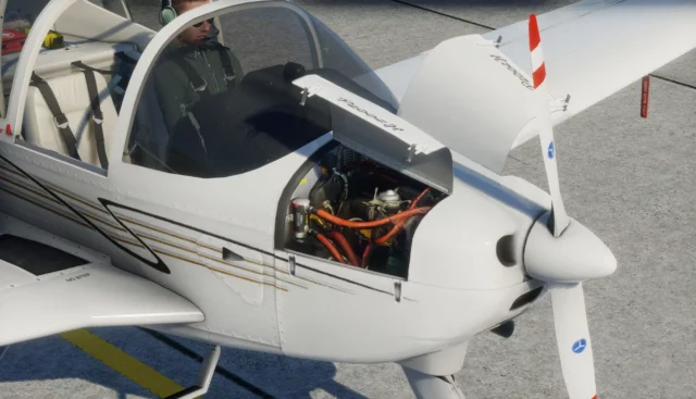 - Interaktive Vorflugkontrolle: Eine komplette Vorflugkontrolle ist möglich, inklusive Entfernen von „Remove before Flight“ Markierungen, Öl- und Treibstoffkontrolle.