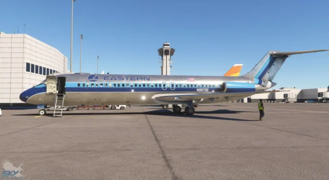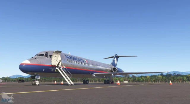 - Detailliertes Außenmodell: Zwei verschiedene Modelle (DC-9-10 und DC-9-30) mit hochauflösenden PBR-Texturen, dynamisch flexiblen Flügeln und animierten Komponenten wie Türen, Treppen und Cockpitfenstern.