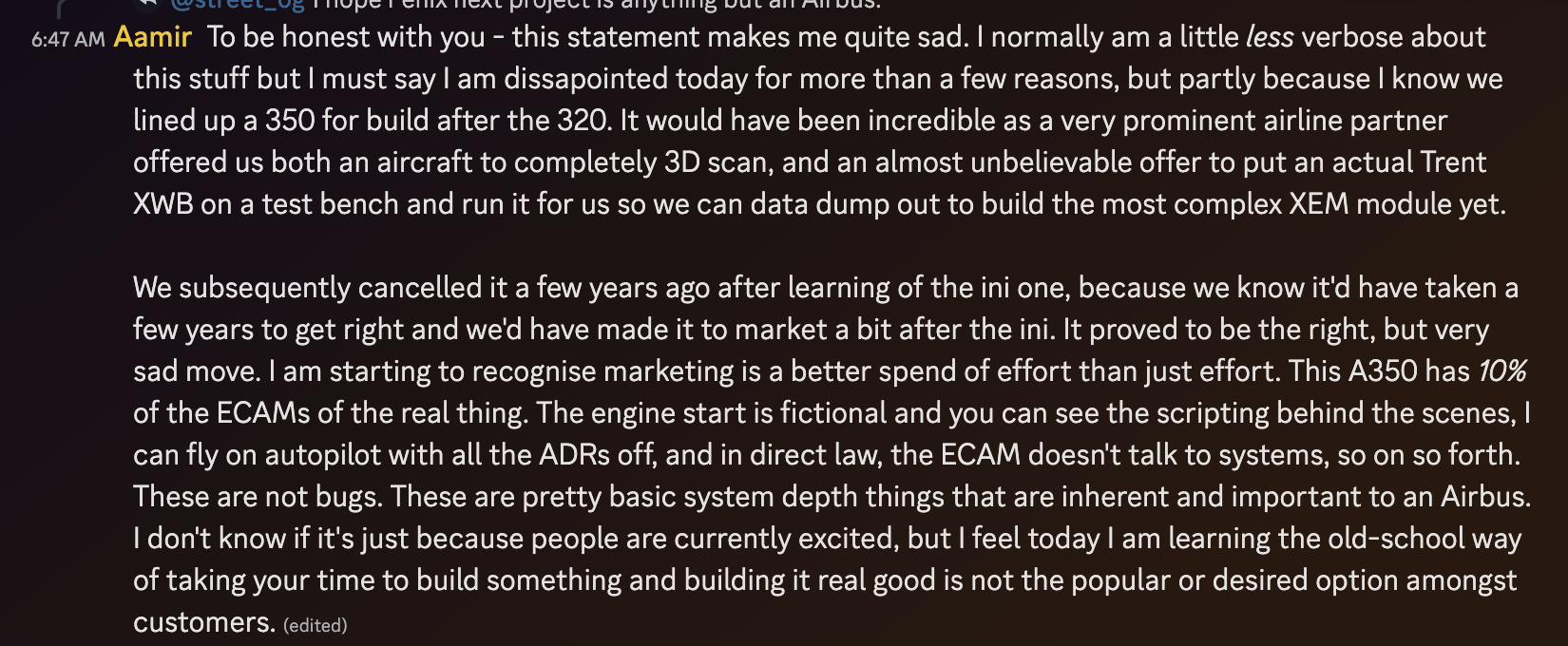 Der Chef von Fenix Simulations, Amir, hat sich in einer bemerkenswerten Stellungnahme im eigenen Discord Server, zum kürzlich erfolgten Release der A350 von Inibuilds geäußert. In seiner Erklärung enthüllt er, dass Fenix selbst an einer A350-Simulation gearbeitet hatte, dieses Projekt jedoch einstellte.