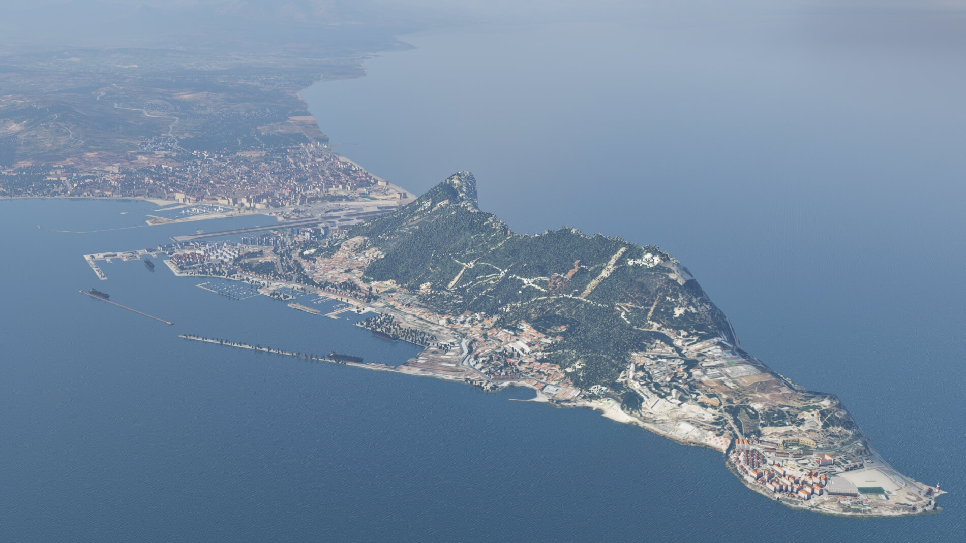Es ist nahezu unmöglich, sich auf andere Aspekte dieses Szenerie-Pakets zu konzentrieren, ohne zuerst den dominierenden Felsen von Gibraltar selbst zu bemerken. Der Felsen ist eine der beiden Säulen des Herkules, ein Name, der von Plinius dem Älteren in seiner Naturgeschichte verwendet wurde. Der höchste Punkt des Felsens an seinem südlichen Ende liegt 1398 Fuß (ca. 426 m) über dem Meeresspiegel. Er enthält etwa 34 Meilen von Menschenhand geschaffene Tunnel und ist verantwortlich für die Luft- und Windströmungen, die die größte Herausforderung für Piloten darstellen, die den Flughafen nutzen.