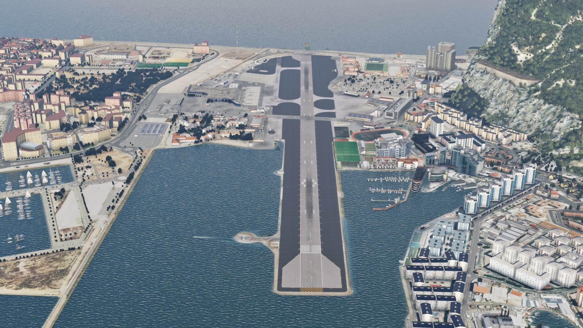 Es hält dennoch nicht stand für niedrige und langsame Flüge, es führt zu bizarren Anomalien auf geneigtem Gelände, und es ist komisch, wenn platzierte benutzerdefinierte Objekte nicht richtig mit der darunterliegenden Fotografie übereinstimmen. Diese Probleme sind nicht spezifisch für das Gibraltar-Flughafen-Paket. Einige Entwickler haben dies angegangen, indem sie es ermöglichten, die Orthobilder je nach Benutzerpräferenz ein- oder auszuschalten. Es wäre ein Plus für dieses Paket, wenn das hier gemacht worden wäre.