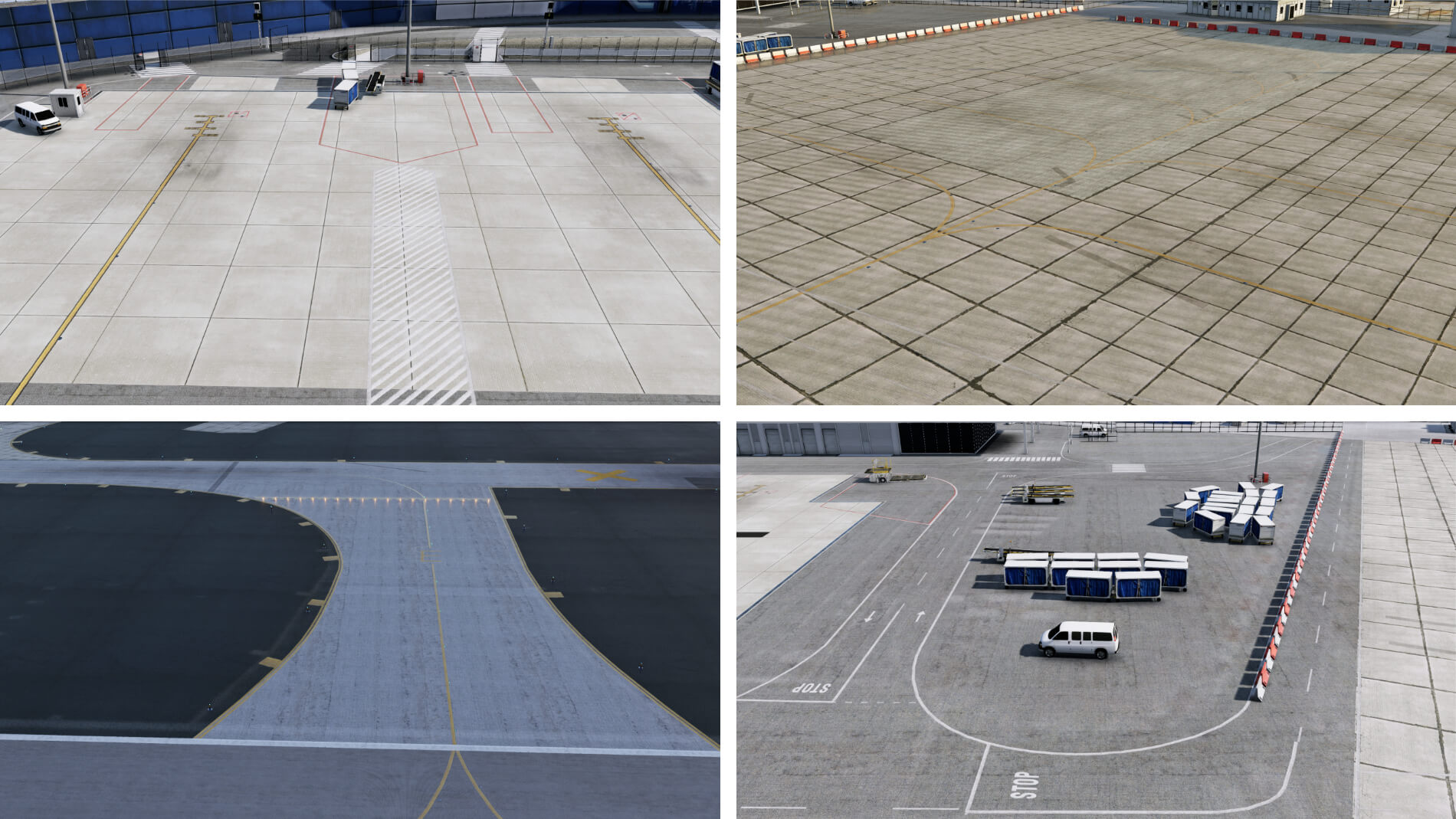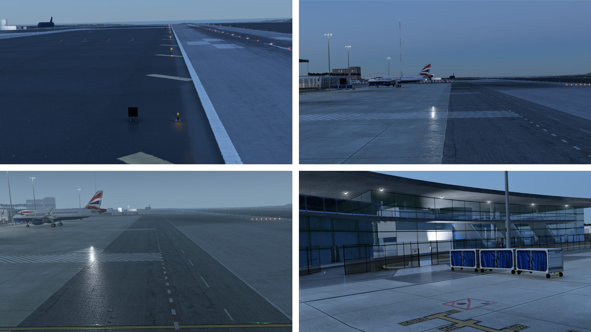 Die Landebahn und das Rollfeld zu beiden Seiten sind visuell ansprechend, teilweise aufgrund von Texturen mit ausreichend hoher Auflösung, die auch bei Ansichten auf Bodenniveau und aus flachen Winkeln gut aussehen. Das Erscheinungsbild ändert sich angemessen mit dem Winkel der direkten Beleuchtung. Die Vorfeld-Texturen sind ebenfalls mit einer detaillierten Textur konstruiert und bewahren eine glaubwürdige visuelle Darstellung. Der einzige Nachteil ist, dass keine der Texturen auf die Feuchtigkeitsbedingungen reagiert, die im Wetterdialog des Simulators eingestellt sind, und einige immer trocken erscheinen, während andere immer nass zu sein scheinen.