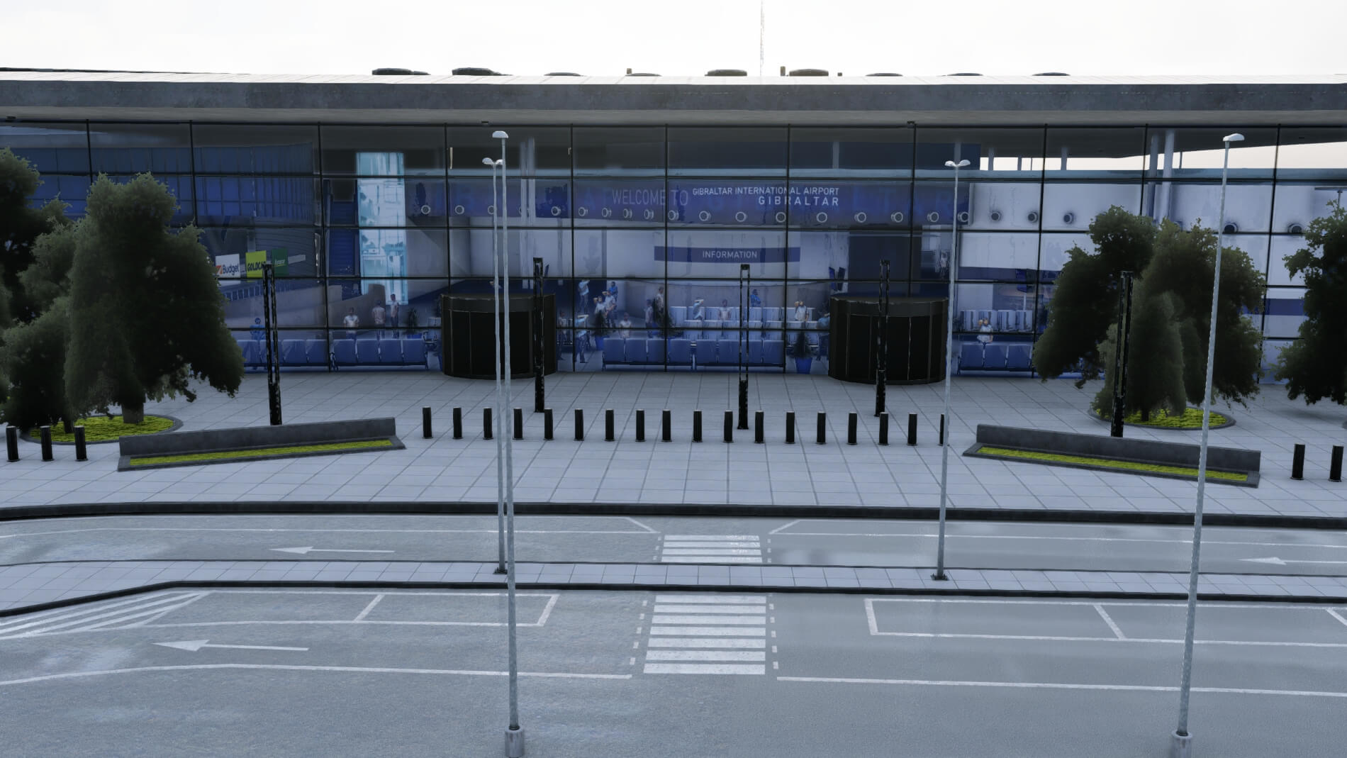 Gibraltar profitiert mit seiner Fülle an Glas erheblich davon, dass die Entwickler sich die Zeit genommen haben, das Glas genau darzustellen und das Innere zu gestalten, das vom Rollfeld aus sehr gut sichtbar ist. Das Modell übersieht nicht die unzähligen Dachleuchten, die von dem Gebäude verwendet werden.