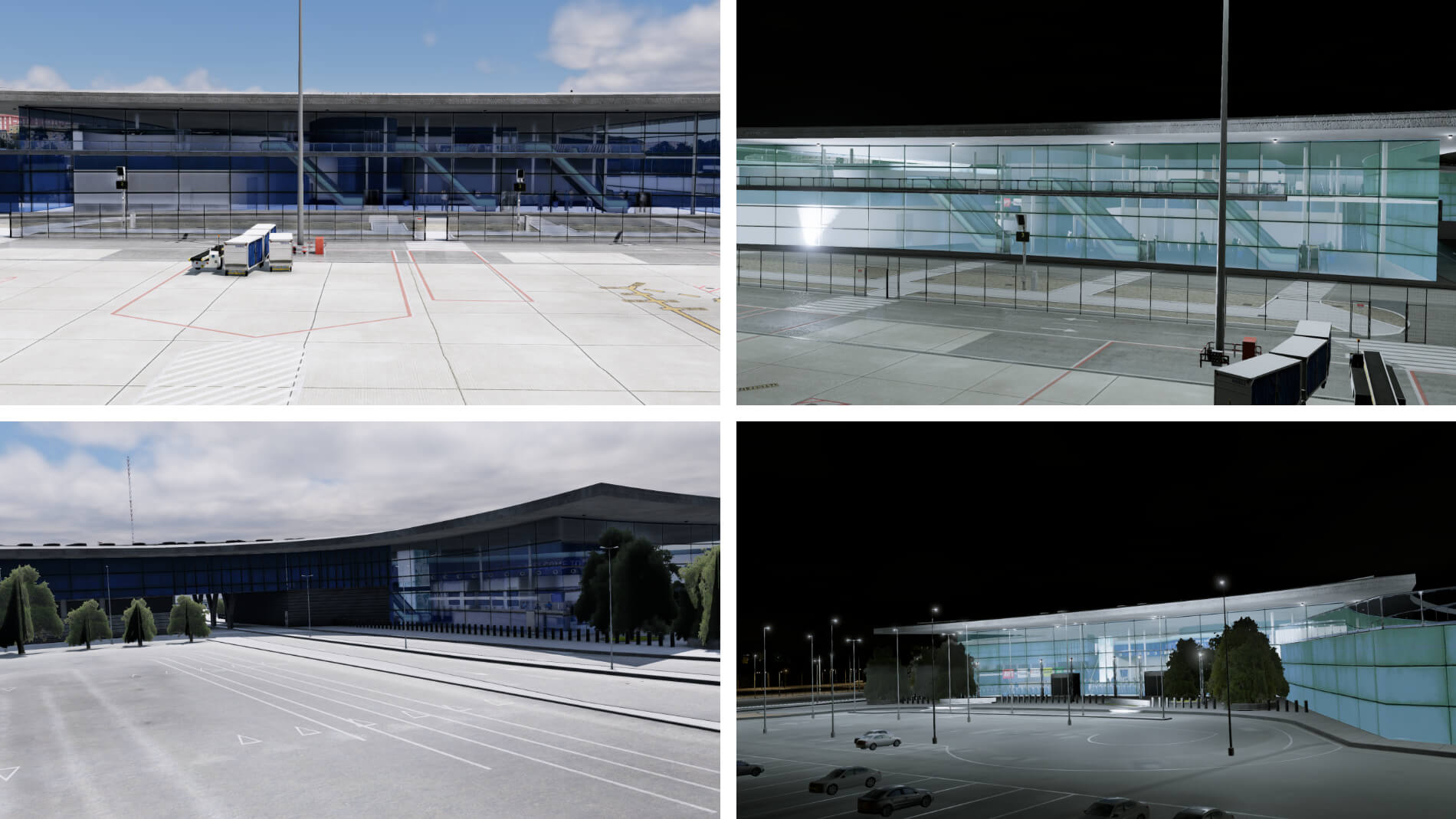 Das Glasmaterial besitzt eine schöne Kombination aus Transparenz und Reflexionsvermögen sowohl von außen als auch von innen. Natürliches Außenlicht beeinflusst das Innere, das bei Abwesenheit von Außenbeleuchtung schön beleuchtet ist und wie erwartet auf den umgebenden Boden fällt. Es gibt viele modellierte Flughäfen, bei denen ein detailliertes Inneres des Terminals für die Erfahrung des Piloten vom Rollfeld aus kaum einen Unterschied macht.