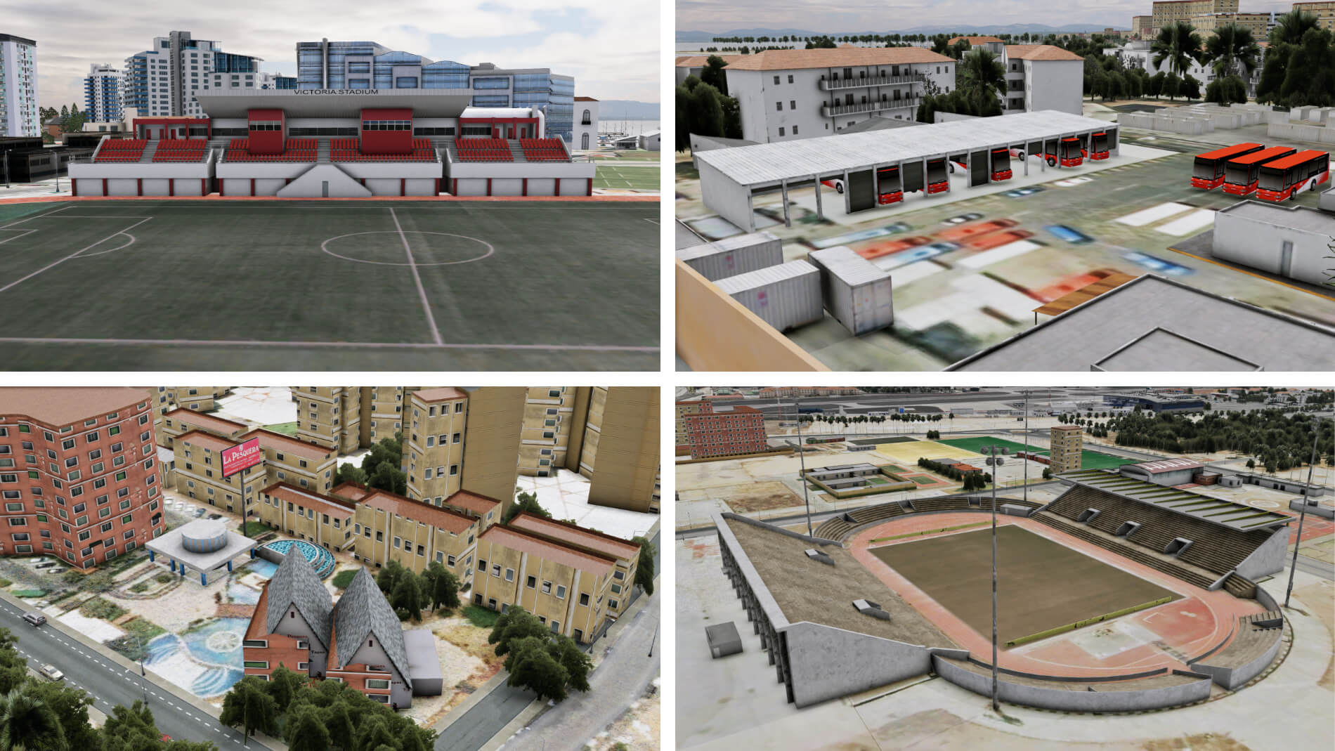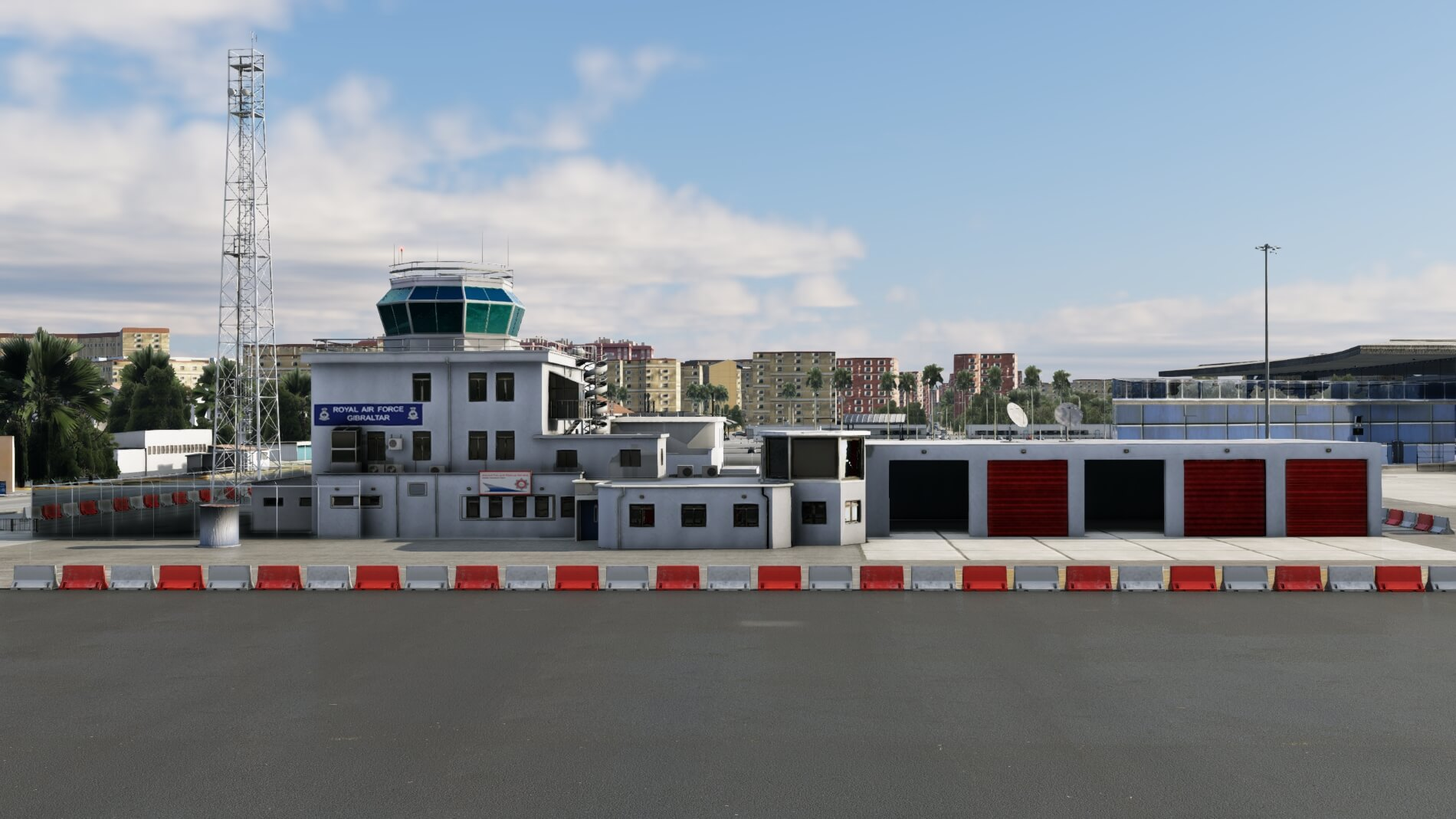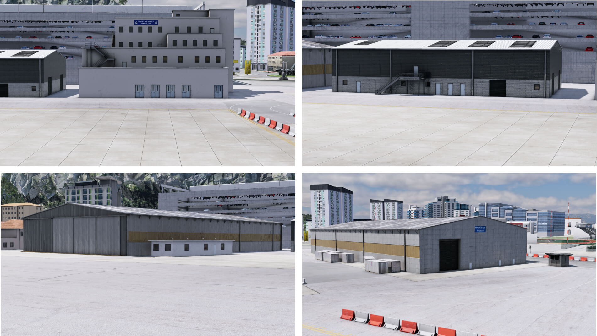 Wie bereits erwähnt, verfügt Gibraltar über drei Vorfeldbereich. Zwei dieser drei besitzen Gebäudeeinrichtungen mit einigen Nebengebäuden, die östlich des nördlichen Vorfelds errichtet wurden. Das zivile Vorfeld ist umgeben vom Flughafenterminal, der Feuerwache und der Flugsicherung. Das Terminalgebäude ist eine meisterhafte Konstruktion mit detaillierter Modellierung innen und außen. Dieses Gebäude im modernen Stil wird dominiert von den vom Boden bis zur Decke reichenden Glaswänden, die den Passagiereingang, die Haupthalle, die Abflughalle und die Lounge im zweiten Stock umgeben.