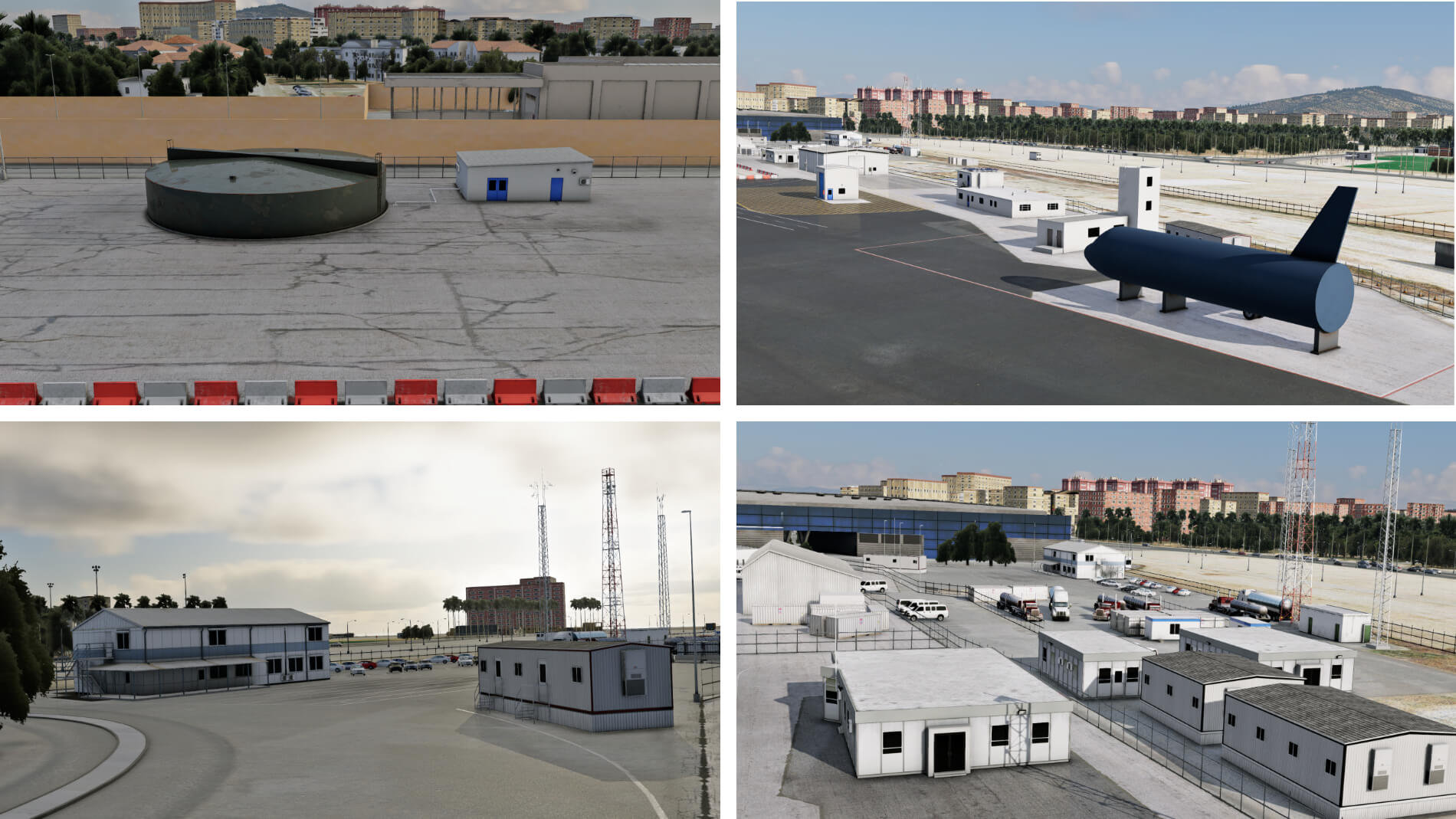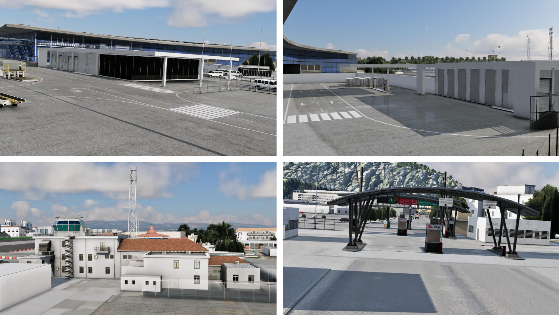 Rund um das Terminal in der Nähe des zivilen Vorfelds befinden sich das Allgemeinflug-Terminal, das von Geschäfts-, Charter- und Freizeitflügen genutzt wird, das Flugsicherungsgebäude mit Kontrollturm und die Feuerwache. Mehrere andere Hilfsgebäude und Grenzübergangspunkte werden ebenfalls von den Entwicklern dargestellt. Details werden nicht übersehen, und der Kontrollturm verfügt über ein teilweise modelliertes Inneres. Alle Nebengebäude haben Texturen, die auf die wechselnden Lichtbedingungen reagieren und Schatten auf eine Weise erzeugen, die ihrem Erscheinungsbild visuelle Tiefe verleiht. Das einzig Seltsame in diesem Bereich ist, dass einige der Gebäude oder Gebäudeteile eine sehr reflektierende Oberfläche zu besitzen scheinen.
