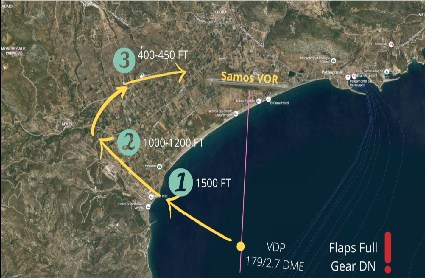 Die Anflüge auf Samos sind speziell und herausfordernd, weil es nur einen VOR/DME-Anflug direkt auf das Drehfunkfeuer gibt. Offizielle Anweisungen, wie die 09 oder die 27 zu erreichen sind, werden nicht gegeben.
