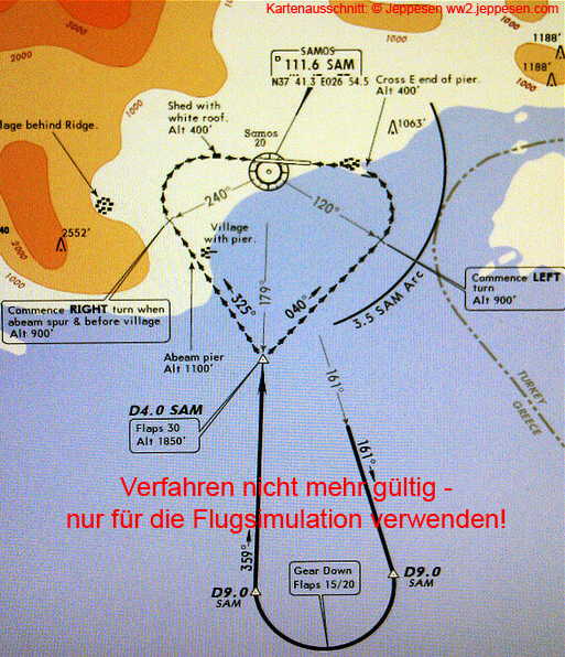 Dieser Anflug ist mit Vorsicht durchzuführen, denn die Grenze zur Türkei kommt dabei sehr nahe… An D 4.0 SAM wird eine Rechtskurve auf 040 Grad geflogen. Beim Durchflug von Radial 120 outbound SAM folgt eine Linkskurve auf den Hafen der Stadt Pythagoreion auf 400 Fuß Höhe über Grund, das Ausrichten auf die 27 sowie die Landung.