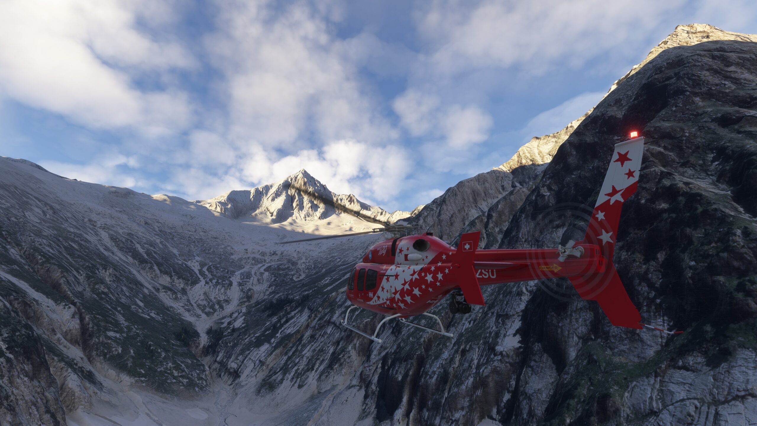 Dann noch einige Flüge von Air Zermatt am Matterhorn über den Großen Aletschgletscher, vorbei an Eiger und Grindelwald nach Bern. Der Heli fliegt sich sehr gutmütig, optisch ein Sahnestück. Alle Flüge in VR geflogen.