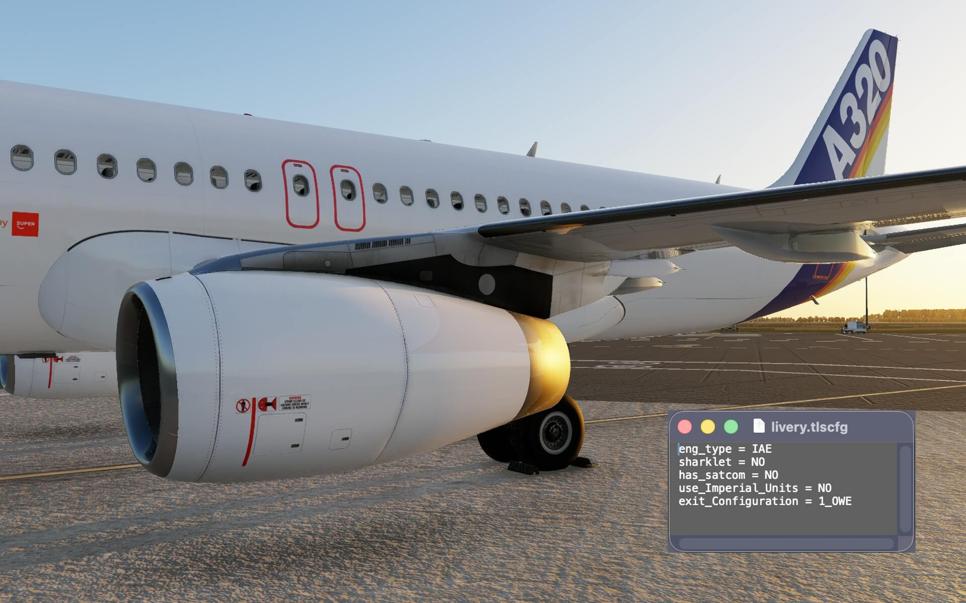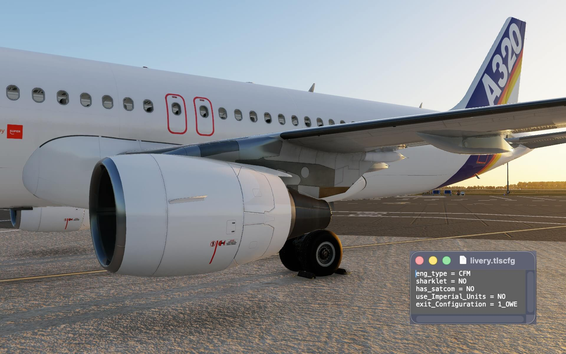 Eine andere, elegantere Lösung, die auch mehr vordefinierte Optionen bietet, ist die Verwendung der livery.tlscfg (livery toliss configuration) Datei. Für weitere Informationen zur Verwendung der livery.tlscfg-Datei laden Sie das neueste ToLiss A320neo Paintkit herunter, das die ceo-Dateien enthält, und lesen Sie die Textdatei Livery Config Explanation. Wenn Sie diese Datei in der Lackierung verwenden, ist es nicht notwendig, [IAE] oder [CFM] zum Lackierungsdateinamen hinzuzufügen. Und wenn eine Lackierung diese Datei nicht hat, können Sie diese jederzeit hinzufügen, indem Sie sie kopieren und in das Stammverzeichnis der Lackierung einfügen und mit den notwendigen Zeilen nach Ihren Wünschen versehen.