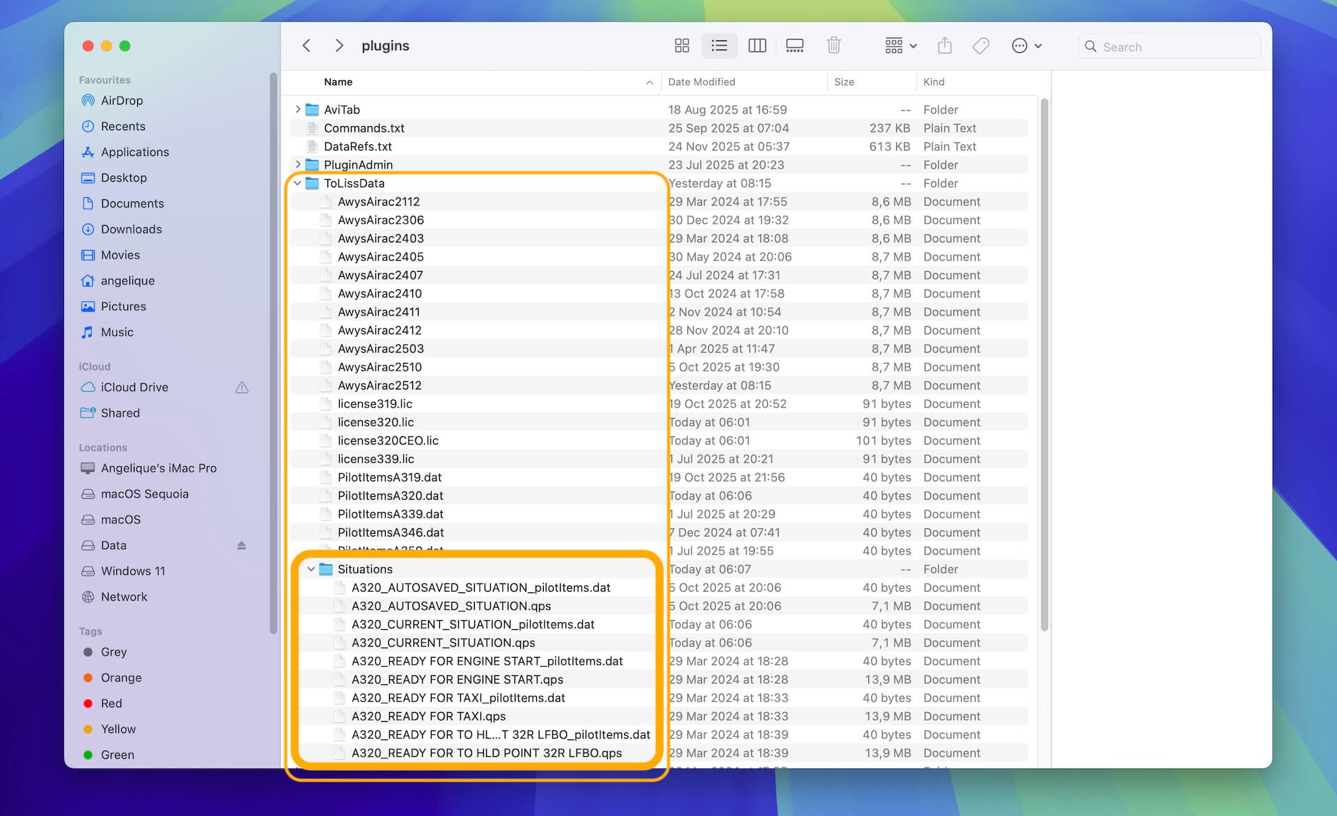 Basierend auf einer grundlegenden ToLiss A320-Konfiguration, die die standardmäßige A320neo und A320ceo-Erweiterungen beinhaltet, sollten Sie am Ende insgesamt 7 Liveries-Ordner und 5 Acrobat-Dokumente im manuals-Ordner haben.