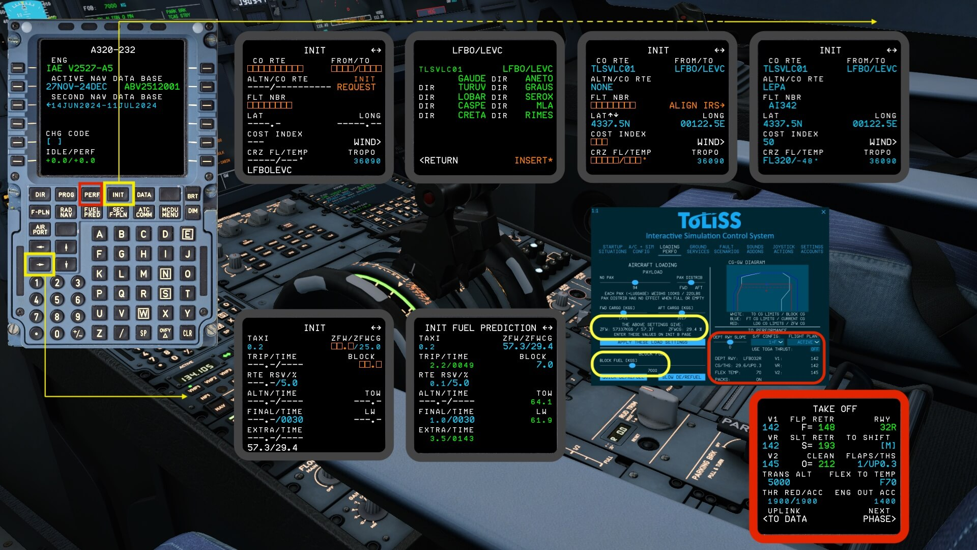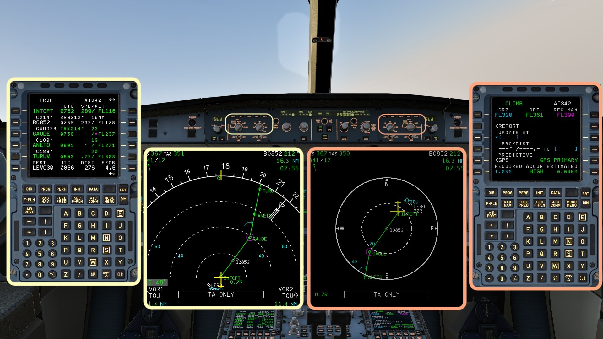 Von nun an wird der Steigflug etwas entspannter sein. Ein paar Worte zum modellierten ToLiss FMGS (Flight Management and Guidance System). Das modellierte Auto Flight System von ToLiss ist so konzipiert, dass es sich wie ein echtes Airbus-Flugzeug verhält. Die modellierten MCDUs arbeiten unabhängig voneinander, und jede hat ihr eigenes 2D-Pop-up. Unabhängig bedeutet, dass sie als Master und Slave arbeiten.