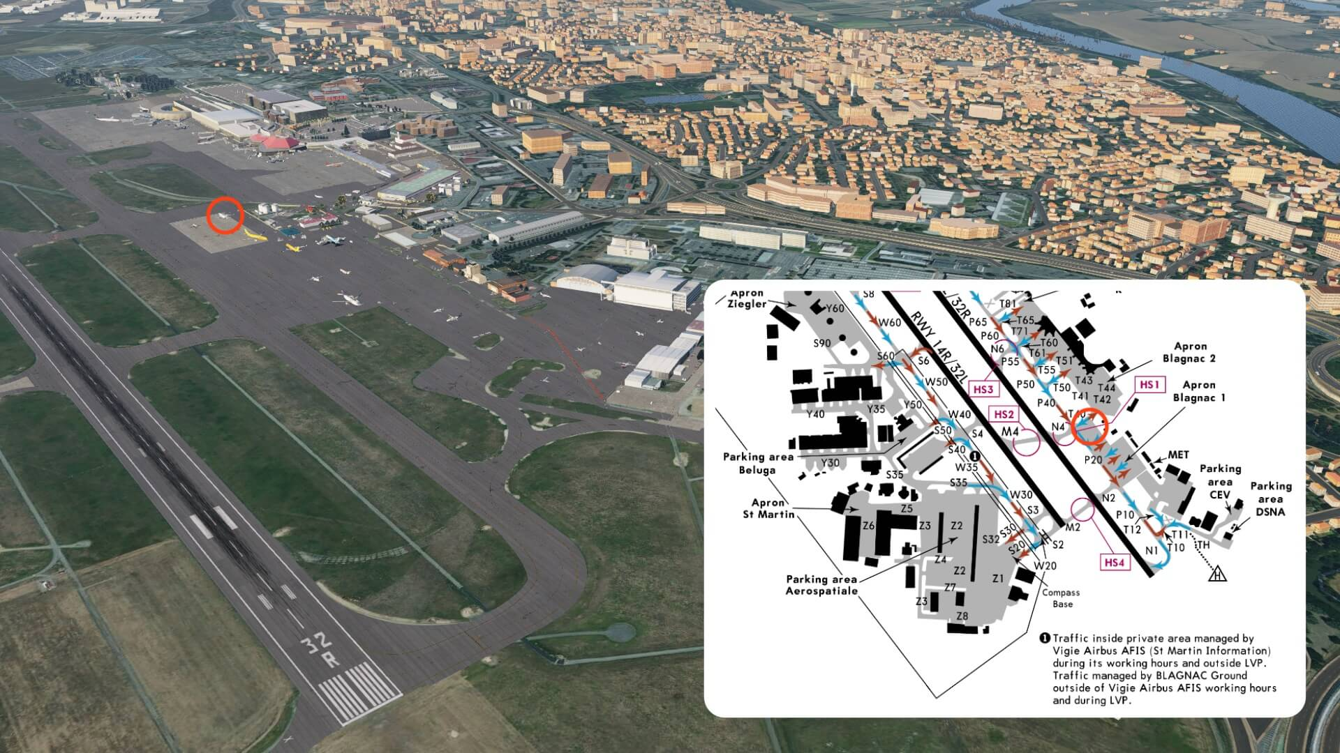 Ich stehe auf RAMP D20 (auch bekannt als APRON Blagnac 1) geparkt. Das Rollen zur Landebahn 32R, die gleich um die Ecke liegt, erfolgt über P20 – P10 und hält bei N1.