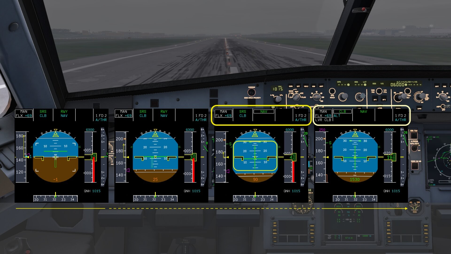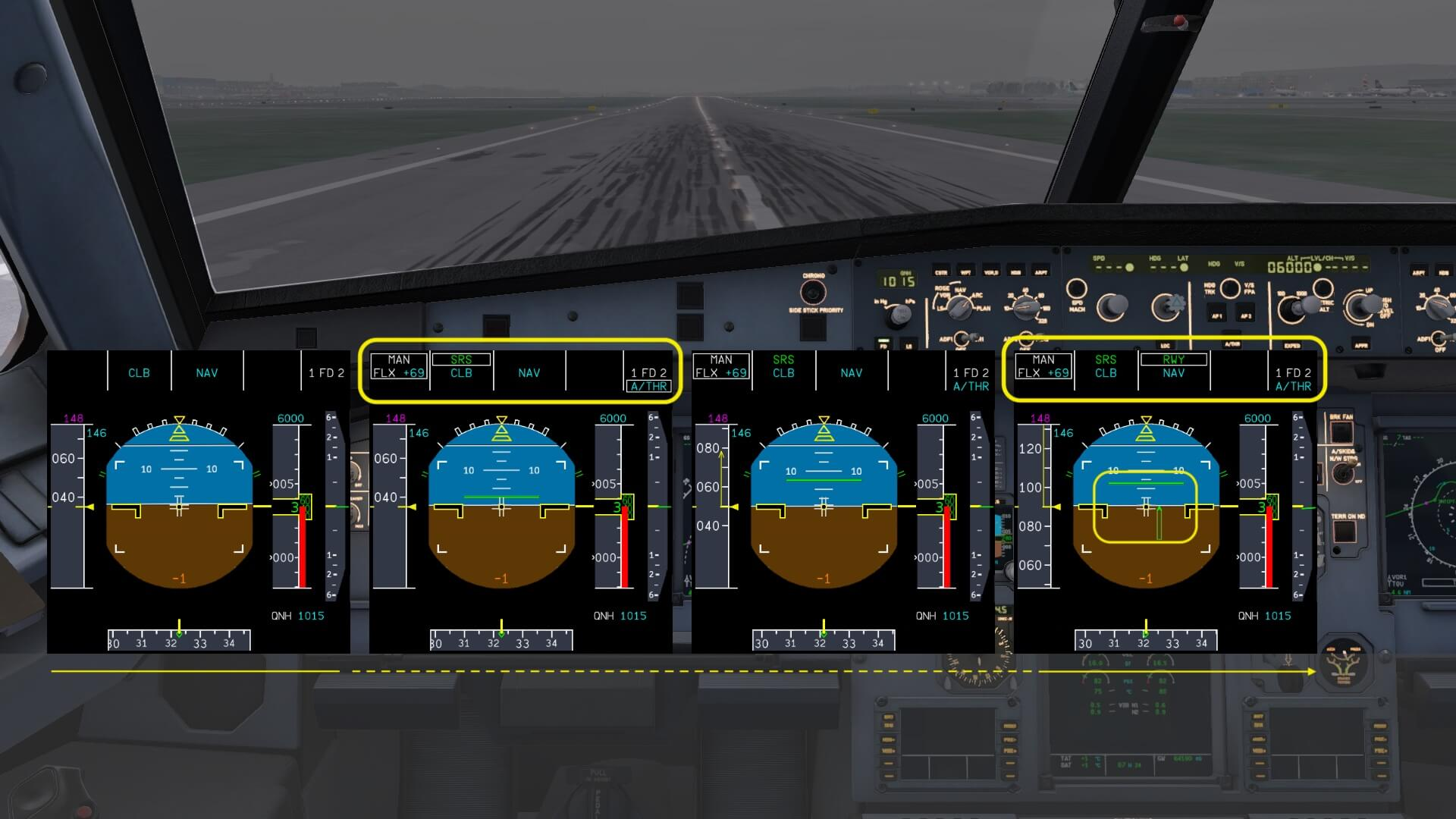 Hier einige Hintergrundinformationen zu den FMA-Anzeigen RWY und SRS. RWY ist der laterale Modus, der die seitliche Führung vom Beginn des Starts bis zu 30 Fuß bereitstellt, falls ein geeignetes LOC (Localizer)-Signal verfügbar ist. SRS ist der vertikale Modus, der die vertikale Führung bis zur Beschleunigungshöhe (Acceleration Altitude) bereitstellt. Solange die Vorflügel (slats) ausgefahren sind und V2 verfügbar ist, wird SRS automatisch aktiviert, wenn Schub für den Start gegeben wird. Es befiehlt eine Geschwindigkeit von V2 + 10 während des Normalbetriebs. Wenn ein Triebwerk ausfällt, wird V2 befohlen. SRS hält auch eine minimale Steigrate aufrecht, unabhängig von der Geschwindigkeitsregelung, um Schutz vor Windscherung zu bieten. Bei der Beschleunigungshöhe schaltet SRS automatisch in den CLB-Modus, der das Flugzeug auf die anfängliche Steiggeschwindigkeit beschleunigt.