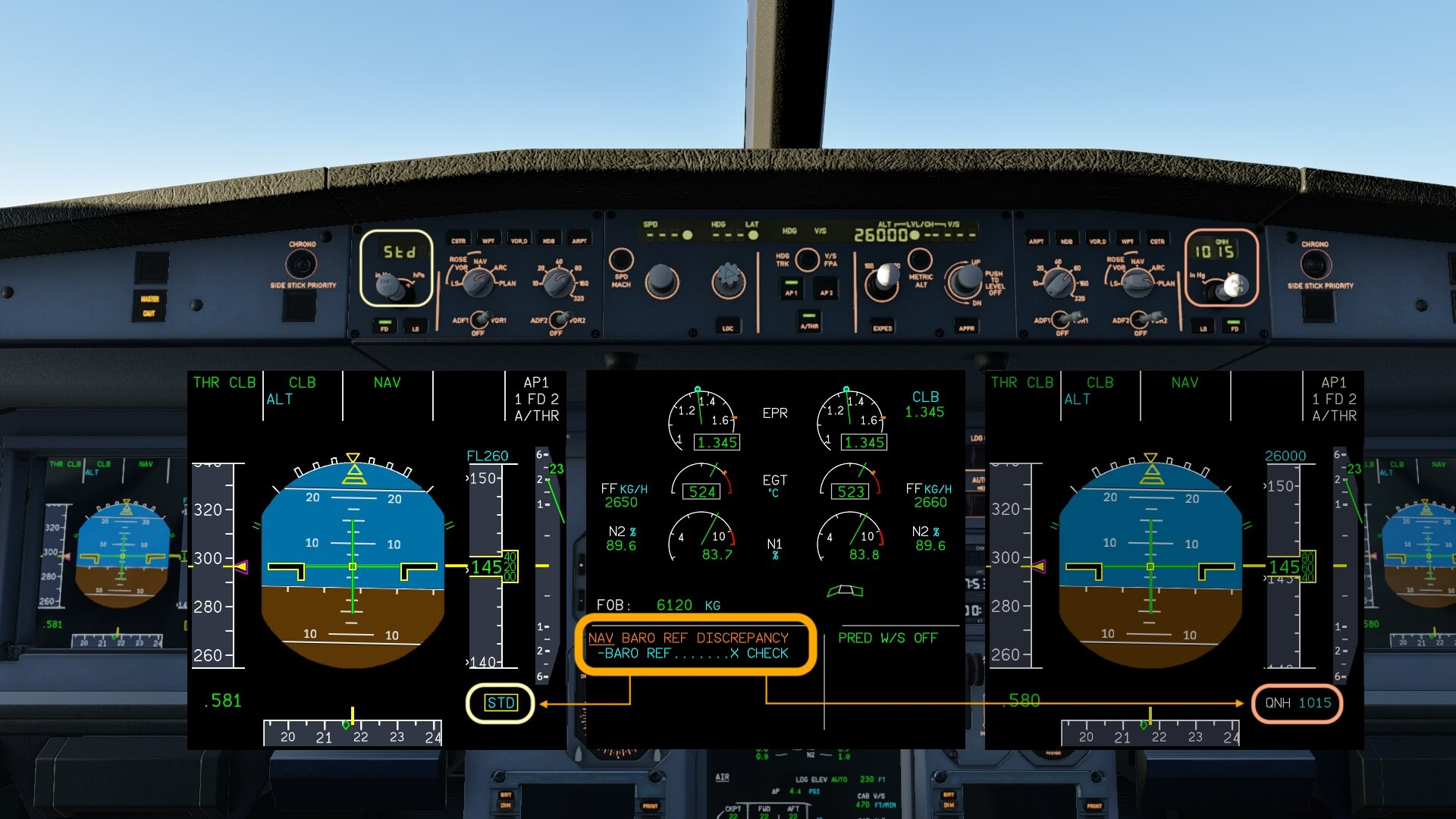 Während des Sinkflugs beginnt der QNH-Wert auf dem CAPT PFD nach einer gewissen Zeit zu blinken, was bedeutet, dass ich von STD (Standard) auf das aktuelle QNH umstellen muss. Vergessen Sie nicht, dasselbe für den F/O (First Officer/Copilot) zu tun; andernfalls meldet das ECAM einen Konflikt in den BARO-Einstellungen.