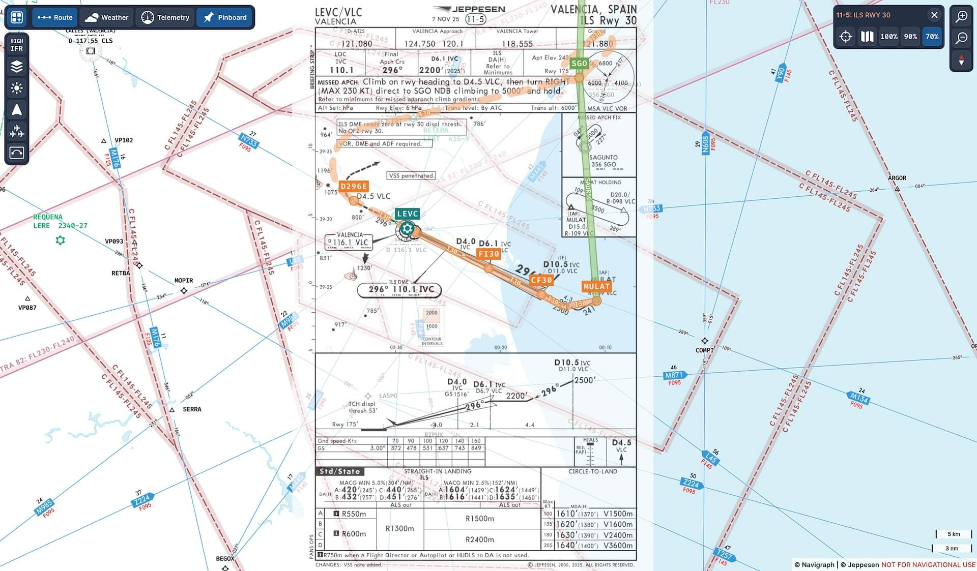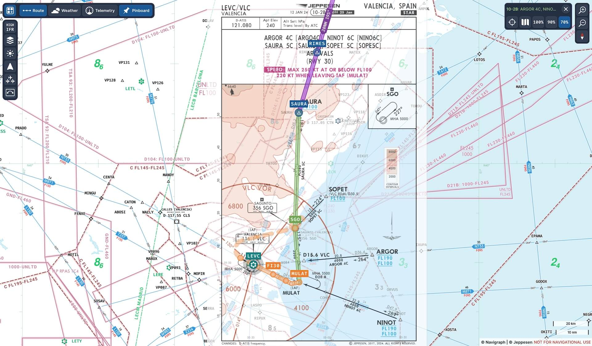 Ich werde die STAR (Standard Terminal Arrival Route) und die Anflugkarten für eine Ankunft in LEVC Landebahn 30 überprüfen. Ich gehe davon aus, dass sich das Wetter nicht geändert hat, was ich mit ATIS überprüfen könnte, aber wenn Sie ohne echtes Wetter fliegen, bleibt es bei Landebahn 30. Die STAR ist, wie bereits erwähnt, SAUR5C. Ein Screenshot der Navigraph Charts ist unten dargestellt. Sie beginnt mit dem Wegpunkt SAURA, dann SGO, folgt der grünen Linie und endet mit unserem Anflug am Wegpunkt MULAT. Die orangefarbene Linie stellt den ILS-Anflug Landebahn 30 LEVC dar.