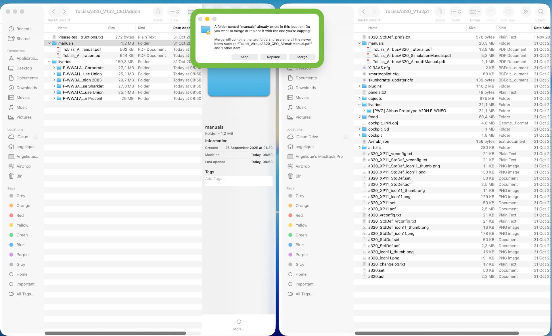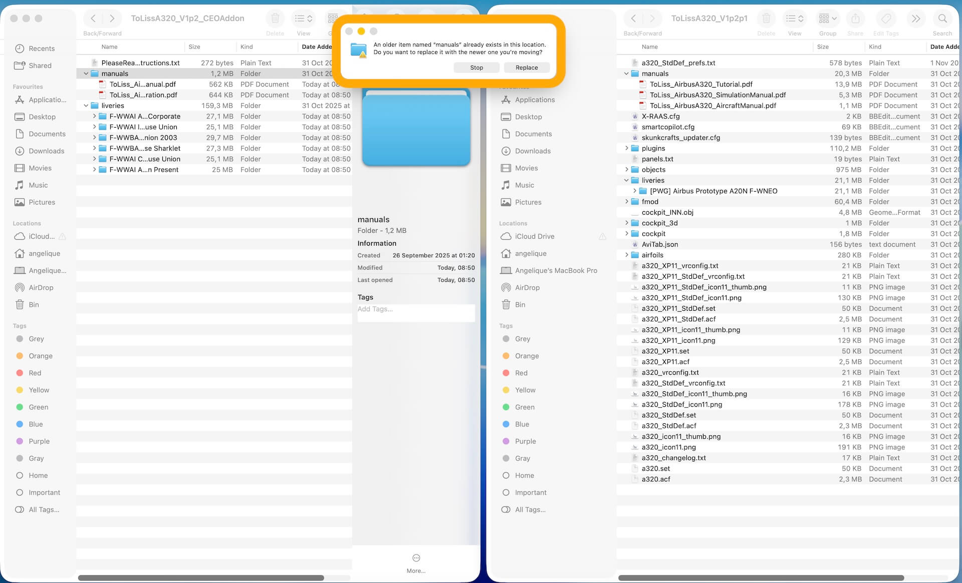 Da ich dieses Add-on-Paket gemischt auf einem iMac Pro mit Sequoia Version 15.7.2 und auf einem Apple MBP M4 mit Tahoe Version 26.1.0 rezensiere, halte ich es für notwendig, den folgenden Satz hervorzuheben: „For the installation to work, you need to select MERGE when copying the CEO folders into the existing A320neo folder. When you accidently select replace, you will delete the existing folders “manuals” and “liveries”, which will remove essential files.“ Als ich jedoch das oben genannte Zusammenführungsverfahren versuchte, hatte ich nur die Wahl zwischen „Stop“ oder „Replace“, die Option „Merge“ war also nicht verfügbar. Es scheint einen Unterschied zu machen, wie ich Dateien mit zwei Finder-Fenstern von einem Ordner in einen anderen kopiere oder zusammenführe. In einem Fall sehe ich die Option MERGE nicht, wenn ich es aber auf die andere Weise mache, sehe ich eine MERGE-Option. Lassen Sie es mich anhand von zwei Screenshots zeigen: