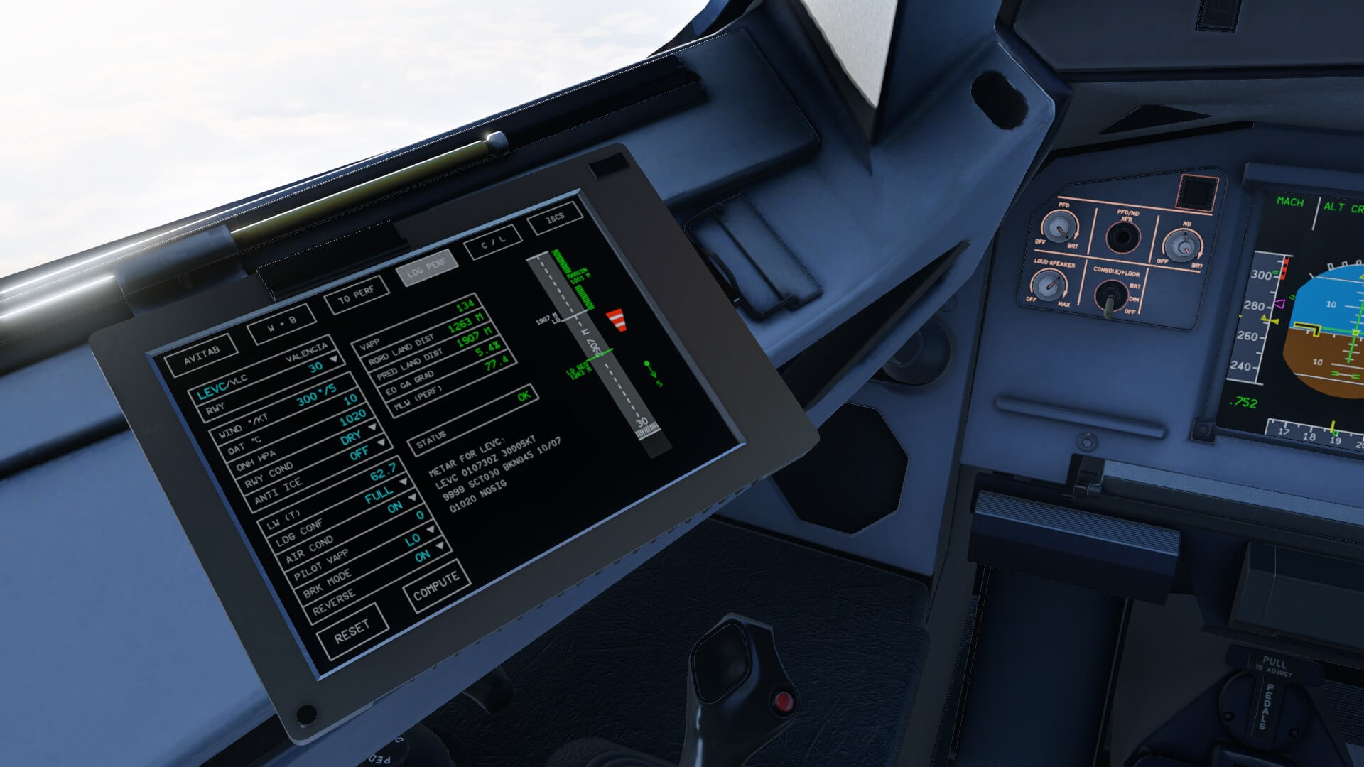 Wenn die Entfernung zum TOD (Top of Descent) ungefähr 60 NM beträgt, wähle ich den ToLiss LDG PERF-Tab, entweder über das ICSC-Popup oder das AviTab. Diese Seite zeigt, wie wir es bereits bei der TO PERF-Seite gesehen haben, die notwendigen METAR-Informationen und die Landestrecke für unsere Ankunft in LEVC. Diese METAR-Daten sind erforderlich, um die MCDU APPR-Seite zu aktualisieren. Daher gebe ich das aktuelle QNH in LSK 1L, die aktuelle Flughafentemperatur in LSK 2L und die Windbedingungen in LSK 3L ein. Anschließend wähle oder gebe ich in LSK 4R die FULL Flaps für die Landung ein.