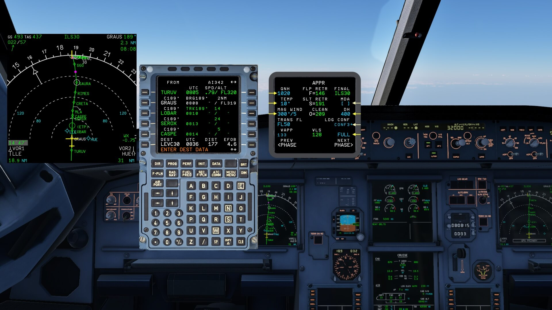 Während des Reiseflugs auf FL320 ist es auch ein Moment der Entspannung und eine Gelegenheit, den Flug mit dieser A320ceo zu genießen. Ich weiß, dass einige Simmer sagen werden, dass sich dies nicht vom Fliegen der A320neo unterscheidet. Grundsätzlich stimmt das, aber ToLiss hat nicht nur neue Triebwerke hinzugefügt. Auch alle typischen A320ceo-Funktionen mussten implementiert werden, was bedeutet, dass viele Dinge „unter der Haube“, wie man sagt, hinzugefügt wurden.