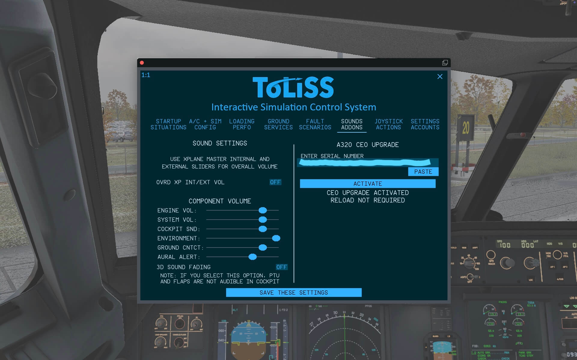 Wie zuvor beschrieben, können Sie das A320ceo-Add-on nur verwenden, wenn die A320neo installiert und aktiviert ist. Vorausgesetzt, Sie haben die A320neo installiert und aktiviert, besteht der nächste Schritt darin, die A320ceo-Seriennummer einzugeben. Diese wird über den ToLiss ISCS-Panel-Tab Sounds/Addons hinzugefügt. Im rechten Bereich können Sie das A320ceo-Upgrade eingeben, auf die Schaltfläche „Activate“ klicken und die A320ceo-Variante hinzufügen. Gehen Sie als Nächstes zum ToLiss ICSC-Tab A/C + Sim Config.