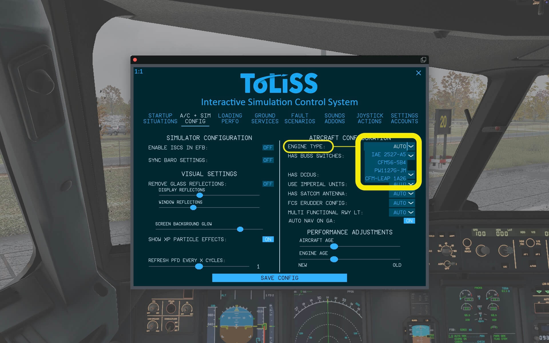 Wenn das ToLiss A320ceo Add-on installiert ist, können Sie den eng_type (Triebwerkstyp) überprüfen oder ändern, der folgende Identifikationen beinhaltet: PWG (PW1100G-JM / A320neo), CFM (CFM56-5B4 / A320ceo), IAE (V2527-A5 / A320ceo) und LEA (LEAP 1A / A320neo).