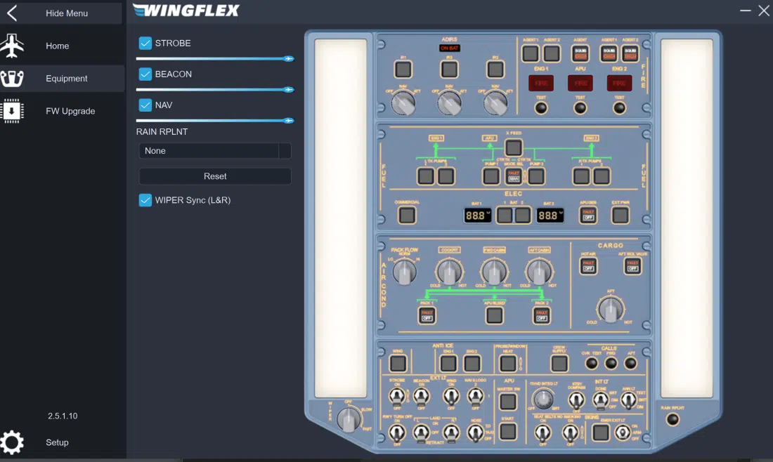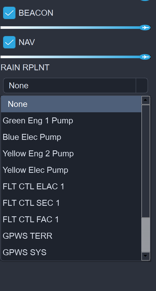 Ein weiteres interessantes Detail ist der auf der rechten Seite befindliche RAIN RPLNT-Druckknopf. Im realen Flugbetrieb sprüht dieser – bei Maschinen, die mit einem solchen System ausgestattet sind – eine Chemikalie von außen auf die Scheiben, die das Regenwasser abperlen lässt. In der WinBridge Software lässt sich dieser Knopf jedoch mit einer alternativen Funktion belegen. Welche Optionen hier aktuell zur Verfügung stehen, könnt ihr auf dem Bild sehen.