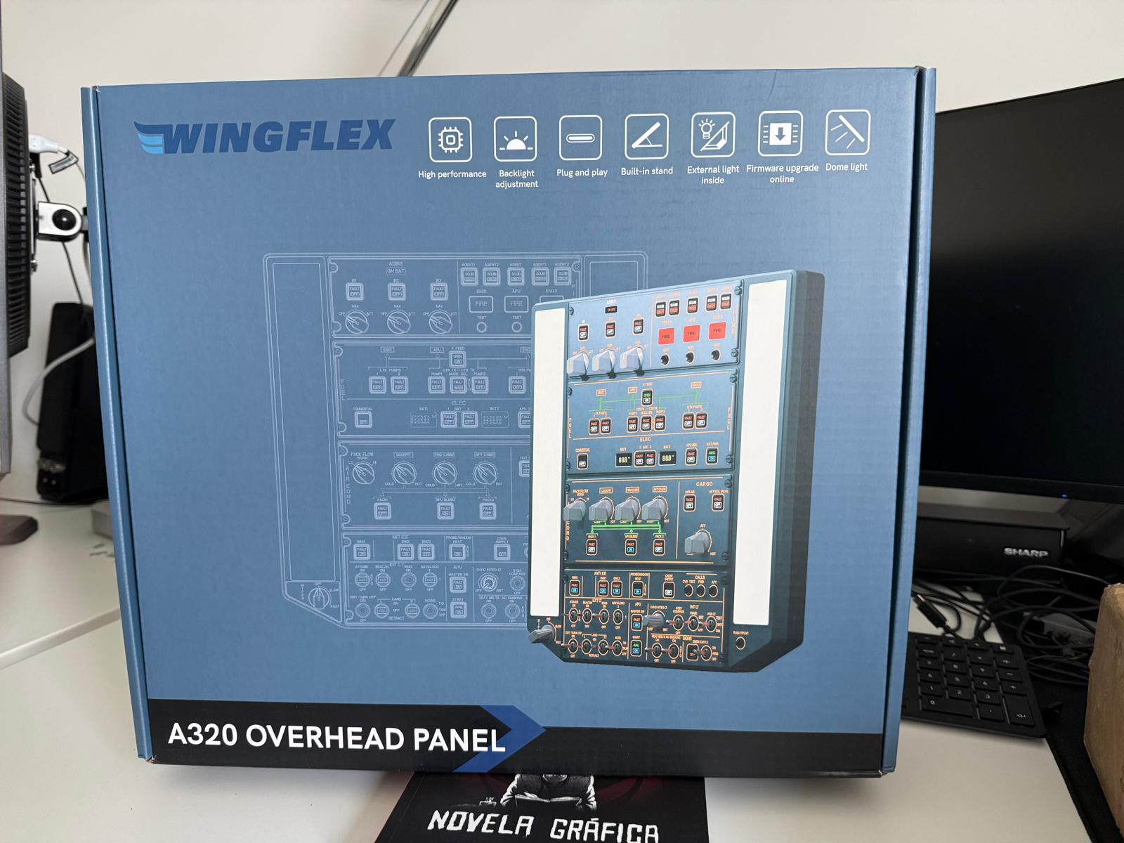 Heute im Fokus: das WingFlex A320 Overhead Panel. Ein Kunststoffblock mit den Maßen von etwa 35 x 40 cm zum Preis von 599,00 USD. Dieser Block ist vollgepackt mit Schaltern, Druck- und Drehknöpfen sowie Licht – unglaublich viel Licht!