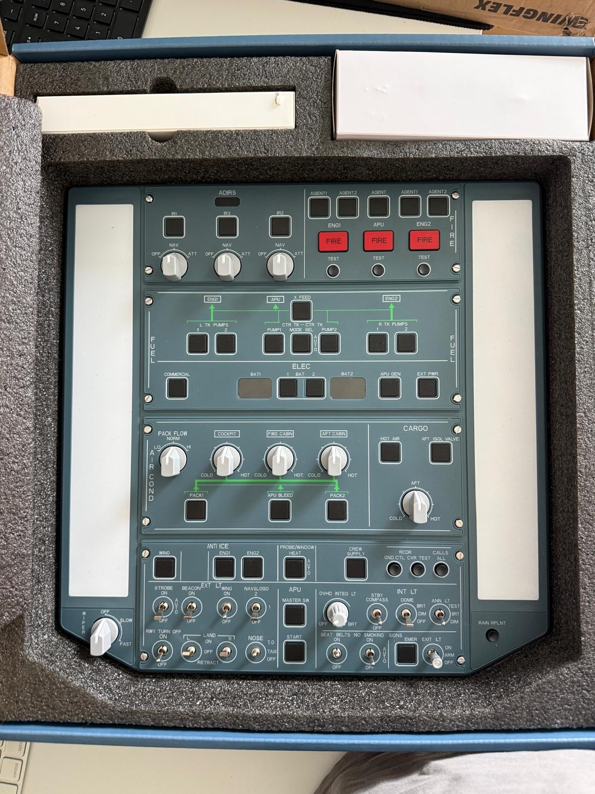 Der Drehregler für die Hintergrundbeleuchtung (OVHD INTG LT) aller Elemente ist wie beim Original voll funktionsfähig und synchronisiert sich direkt mit dem Flugsimulator. Im folgenden Clip seht ihr, wie nah am Original die Startsequenz funktioniert; sogar die Fire-Tests lassen sich absolut realitätsnah durchführen.