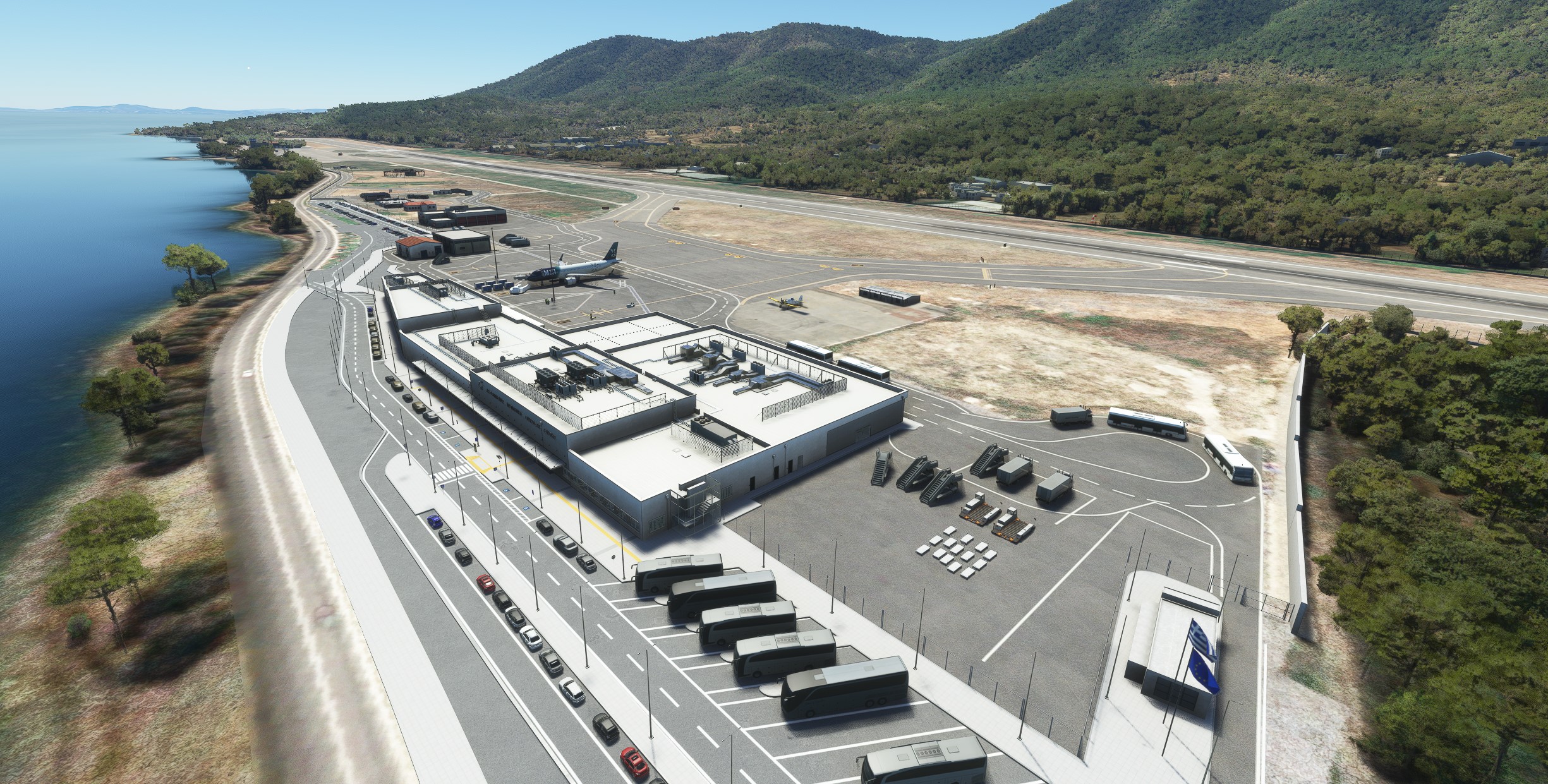 Die Szenerie von Leros Municipal Airport (ICAO-Code: LGLE) imitiert detailliert den gleichnamigen Regionalflughafen auf der griechischen Insel Leros. Der Originalflughafen wird von kleineren Propellermaschinen der