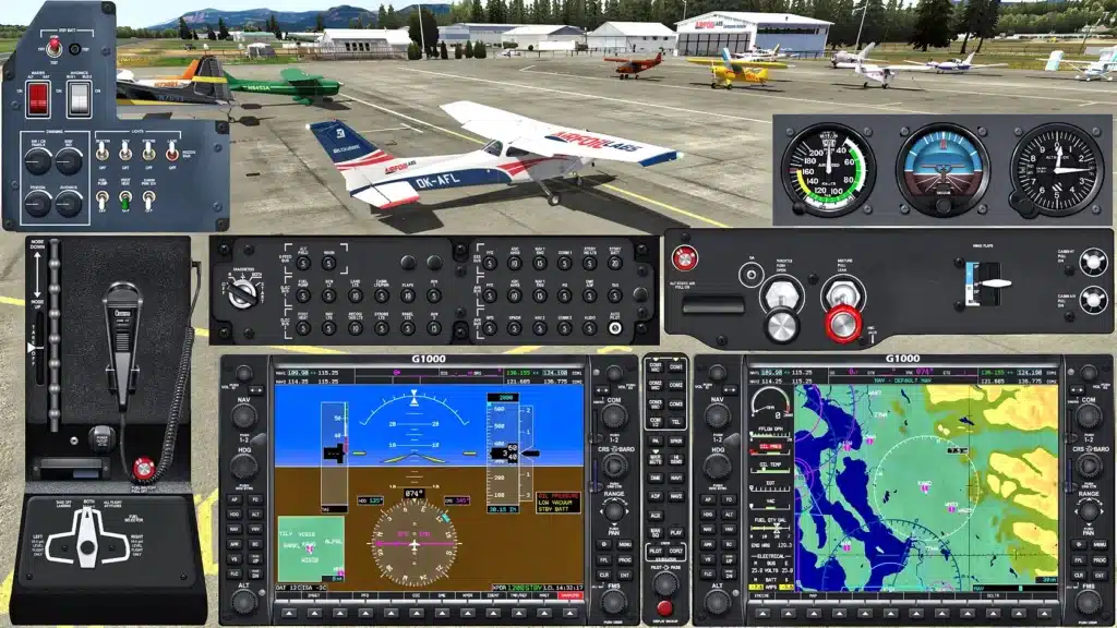 PFD, MFD, Audio Panel, Switches Panel, Standby Instruments, CBs, Throttle Quadrant, Pedestal, Electrical System, Engine with animations 2D Panels