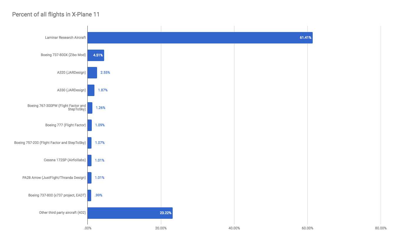 So steht X-Plane immer noch deutlich unter dem Einfluss von GA-Flugzeugen. Und zu über 60% werden die Flugzeuge von Laminar selbst verwendet. Zu 17% ist das verwendete Flugzeug die Laminar C172. Doch schon das erste Nicht.Laminarflugzeug ist ein Airliner. Die kostenlose Zibo-Mod, welche die Standard 737 von Grund auf verbessert. Es folgen die beiden JARDesign A320 und A330. Dann folgt ein Block von FlightFactor Maschinen, nämlich die 767, die 777 und die 757-200. Dann folgt die Cessna 172 von AirfoilLabs, dicht gefolgt von der JustFlight PA 28 Arrow. Direkt danach folgt eine weitere Mod der Standard 737.