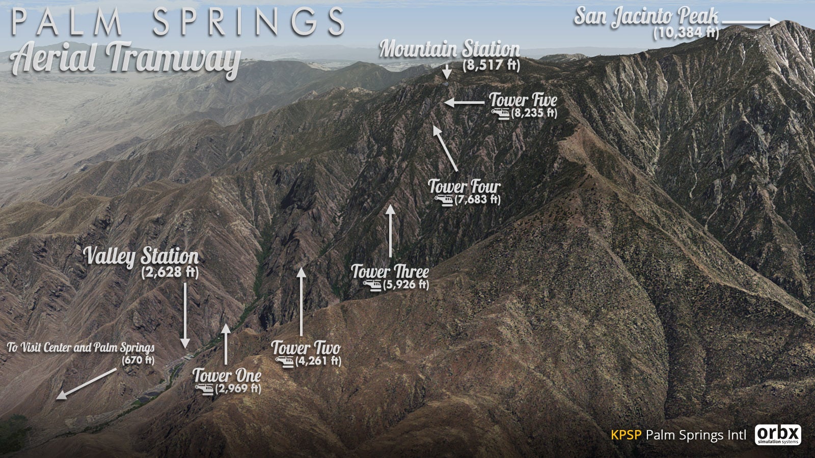 – San Gorgonio Pass Wind Farms – 3000+ wind turbines just north of the airport. – Palm Springs Aerial Tramway – the main tourist trap in Palm Springs, takes visitors from the valley floor to (almost) the top of San Jacinto Peak. – Animated AI helicopter – reporting on road traffic, follows many of the arterial roads to the west of the airport.– Animated train – by special request (@Jon M!)