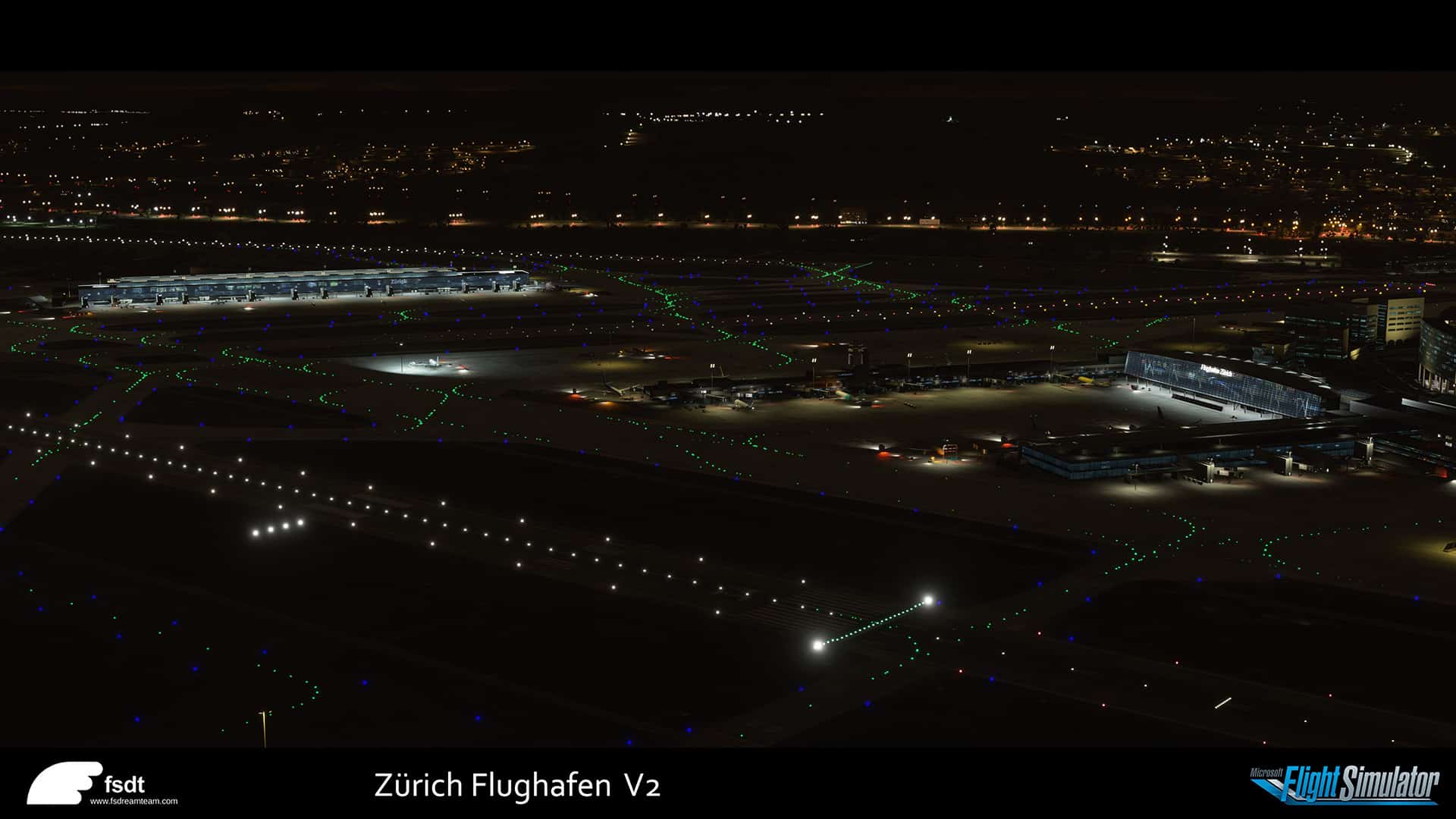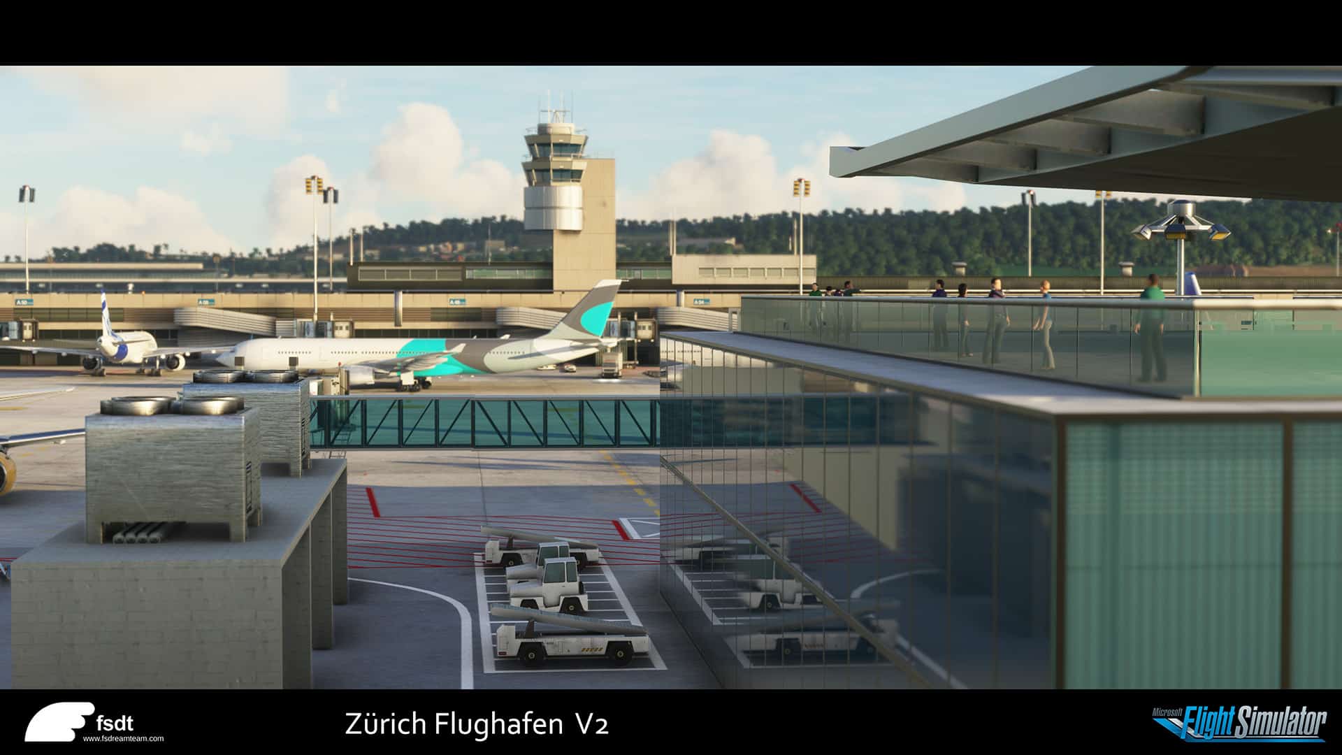 Auch FSDreamteam nutzt hier PBR Materialen auf allen Objekten, dynamische Beleuchtung, detaillierte Bodenmarkierungen und HD Texturen. Ausserdem gibt es spezifische Jetways die den realen Vorbildern entsprechen, Runways mit Gefälle und animierte Personen auf der Besucherterasse.