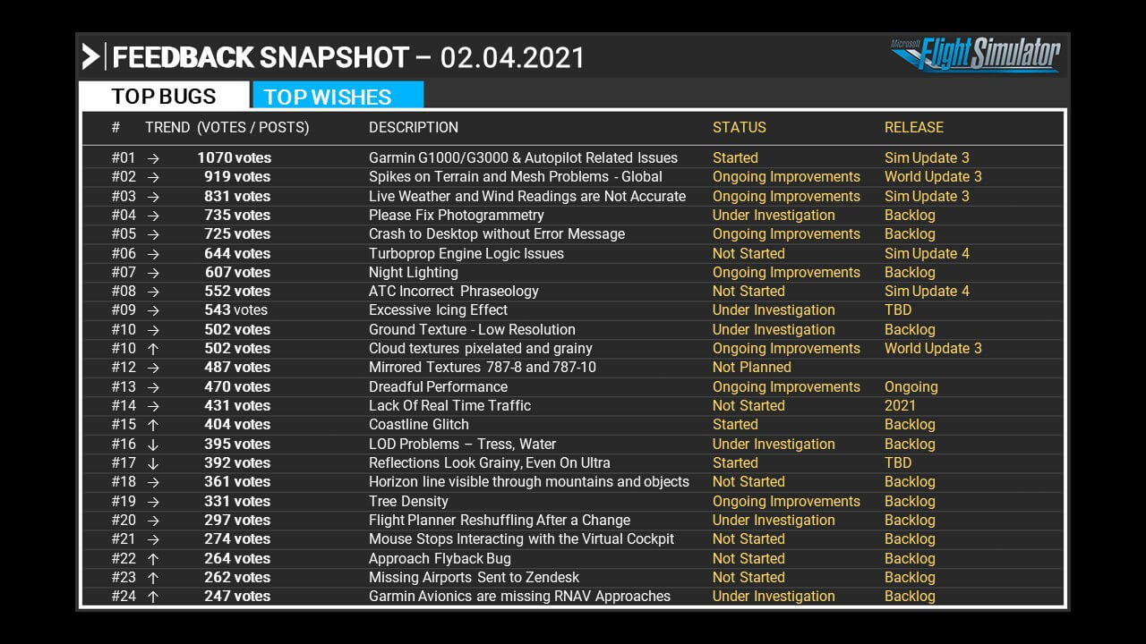Weiterhin mit dabei: die Fehlerbehebungen in Arbeit und die Wunschliste der MSFS-Flieger (jetzt auch mit extra VR-Liste)