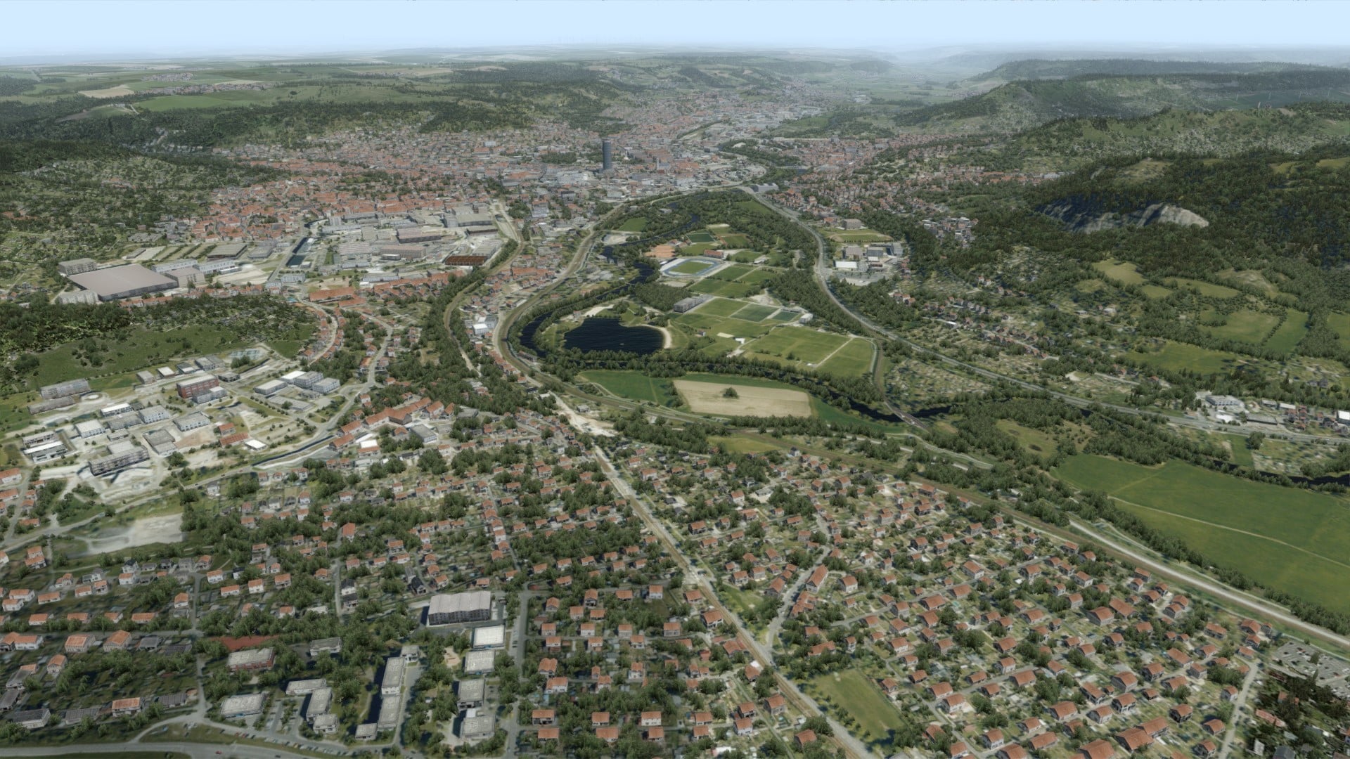 Bereits seit mindestens Februar werkelt Christian Bahr an Jena City. Nun wurde die Stadtszenerie für P3Dv4 als Freeware veröffentlicht und der virtuelle Tourist kann nun „die Perle Thüringens“ besichtigen. Diesen Titel hat die Stadt an der Saale von ihren Besuchern und ihren Einwohnern bekommen. Zu recht, denn Jena hat viele und vor allem schöne Sehenswürdigkeiten anzubieten. Dazu kommt die unglaublich schöne Landschaft in der die Stadt Jena liegt. Vielen Menschen wird der Name Carl-Zeiss ein Begriff sein, der Name steht für anspruchsvolle Optische Geräte, die in der Astronomie, der Medizin und damit in der internationalen Wissenschaft eingesetzt werden. Es lag also sehr nahe das Zeiss-Planetarium mit in die Szenerie zu nehmen.