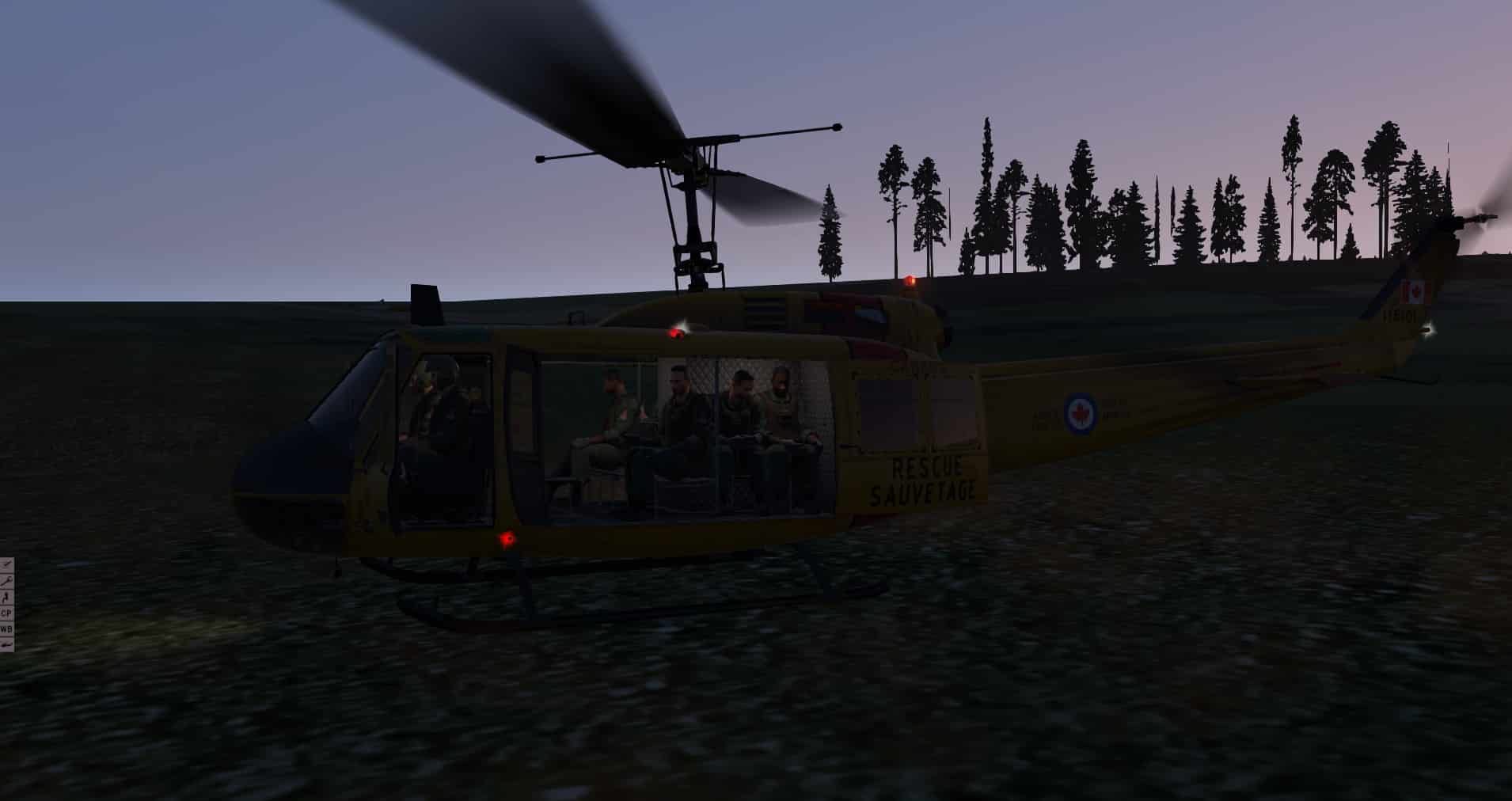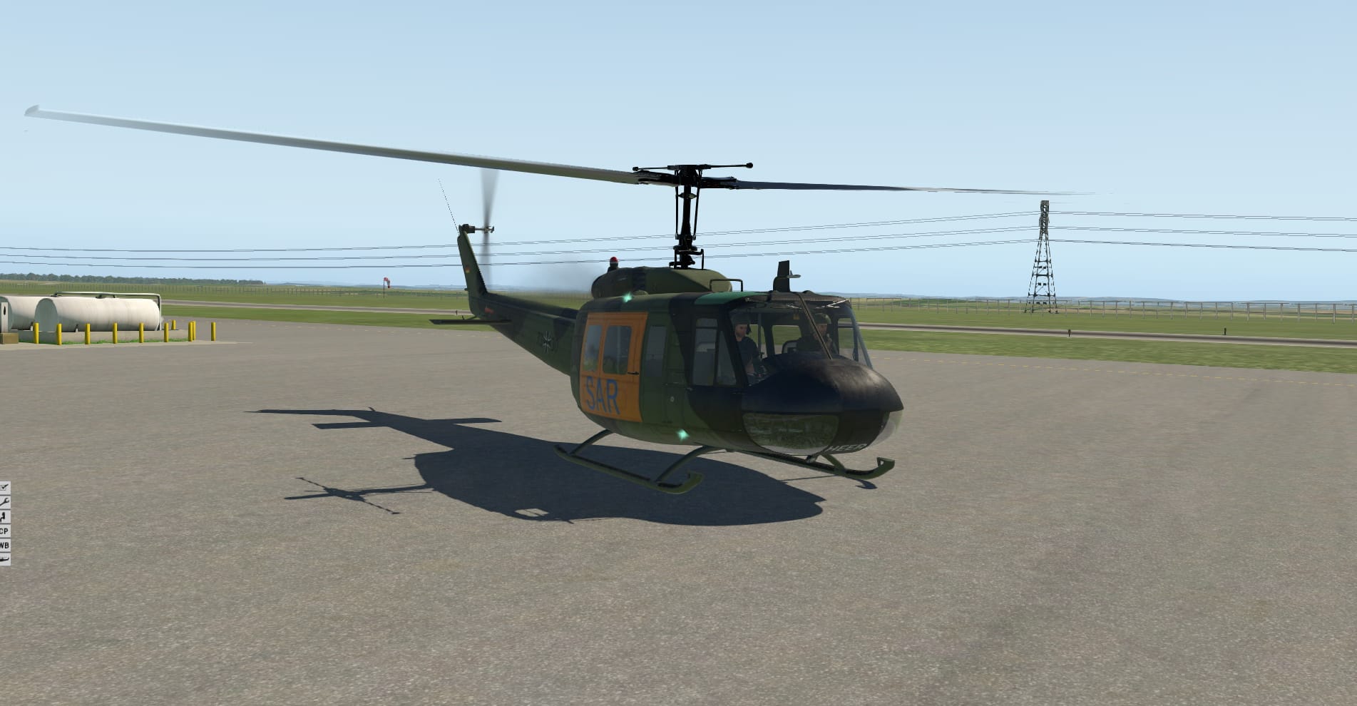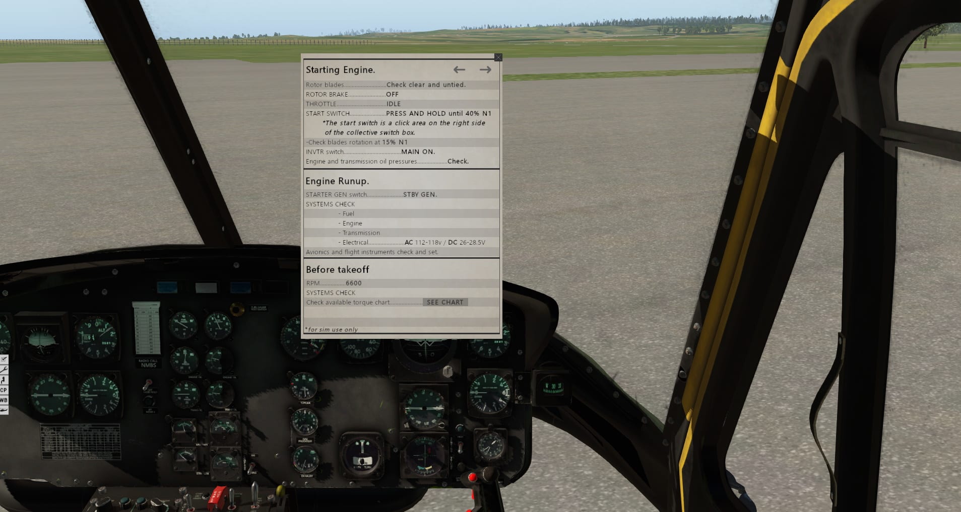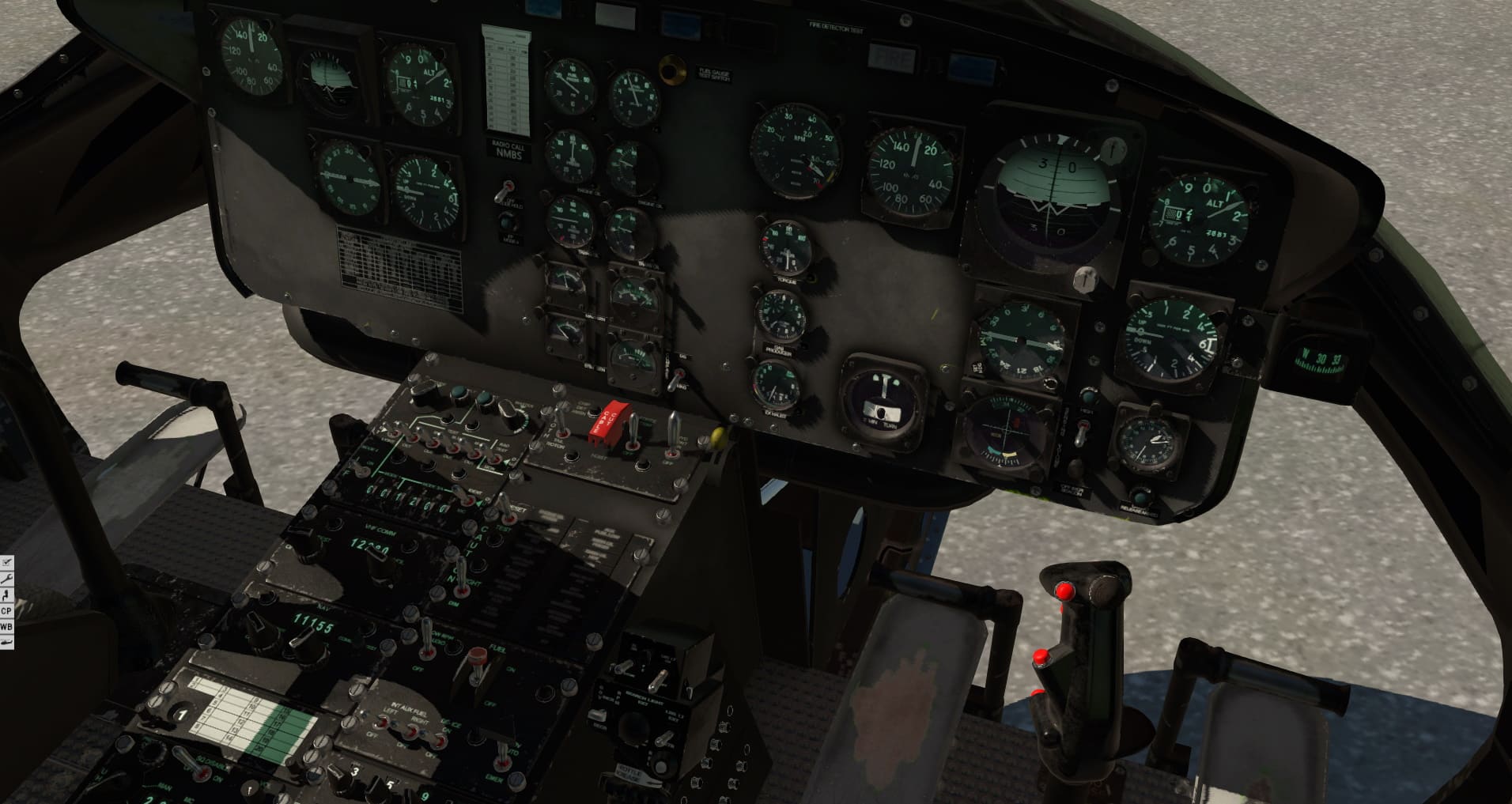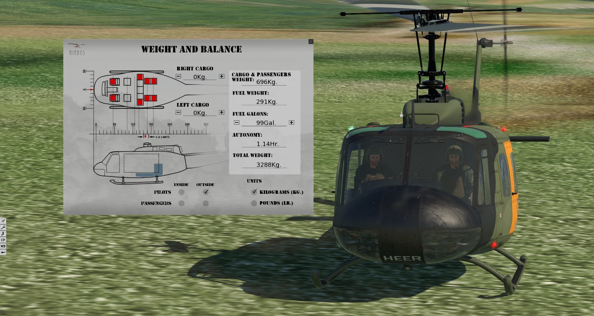 Und jetzt das Beste: Der Klang ist wirklich unglaublich! Vom Anlassen, bei dem übrigens auch das Licht auf Grund des hohen Strombedarfes dunkler wird, bis hin zu verschiedensten Flugsituationen. Ich mag diesen Vogel nur in der Außenansicht oder mit offener Tür fliegen. Gut, das wird meine Frau nicht erlauben, denn diese niederfrequenten Schläge gehen nicht nur in den Magen, sie füllen das ganze Haus. Also Türen zu, und die vielleicht etwas zu sehr gedämpften Geräusche innen genießen. Auch wenn ich Flachbildschirm und Navigationscomputer vermissen werde, gibt es doch noch einiges zu entdecken. Nimbus verzichtet auf einen Eintrag bei den Plugin-Menüs und stellt an der linken Seite des Bildschirms kleine Schaltflächen zur Verfügung. Hier kann man Personal ein- und ausblenden, Gewichte verteilen und ’ne nette Checkliste inklusive einiger Leistungscharts entdecken. Mein Tipp ist, das bei stehenden Rotoren zu tun, denn eines ist Nimbus ebenfalls deutlich gelungen: Mir wird schlecht! Unglaublich invasiv wirkt dieses Schütteln, das man nie wieder vergisst, saß man einmal in diesem Hubschrauber. Ich bin fast nicht in der Lage die Instrumente ordentlich zu lesen. Glücklicherweise nutze ich Monitore und im Moment keine VR-Brille. Mit der soll dieser Hubschrauber ja auch gut zusammenarbeiten. Im Moment bin ich aber froh, dass dieses Wackeln wenigstens aufhört, wenn ich in eine andere Richtung sehe.