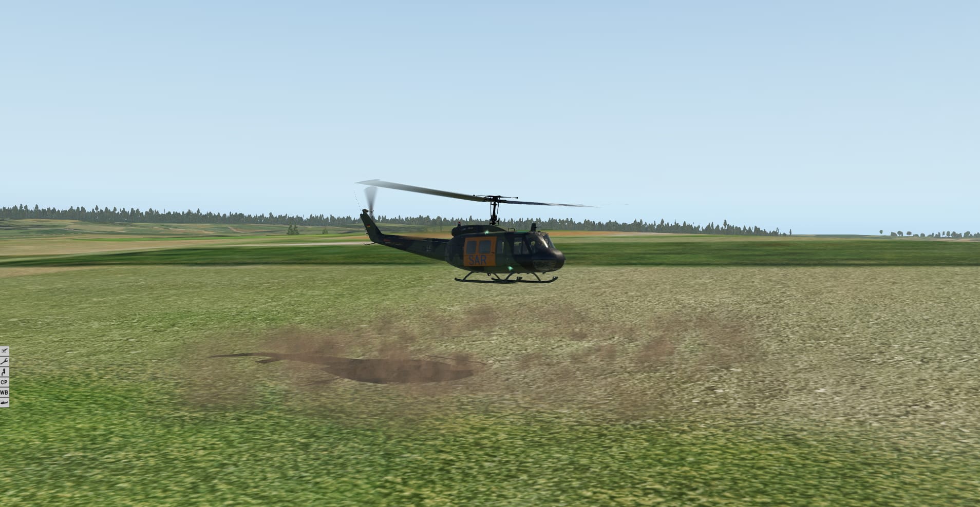 Schnell Ruder, Joystick und Pedale eingestellt und dreckig mit laufenden Rotoren begonnen. So stelle ich mir diese Maschine vor. Jede kleine Änderung an einem beliebigen Steuerelement wirkt sich tatsächlich auf das gesamte Flugzeug aus. Das ist Hubschrauberfliegen. Die Maschine fühlt sich, je nach Situation mal träge mal dynamischer an. Weder der Eindruck einen Bus zu fliegen noch ein nervöses Eichhörnchen bändigen zu wollen; hier ist meine Mitte. Das Abheben und Aufsetzen macht Laune. Der Rotation muss gut mittels Pedalen entgegengetreten werden, der seitliche Druck des Heckrotor ist überdeutlich. Hier wird man länger üben, um sauber abzufliegen, es wirkt aber irgendwie sehr ehrlich.