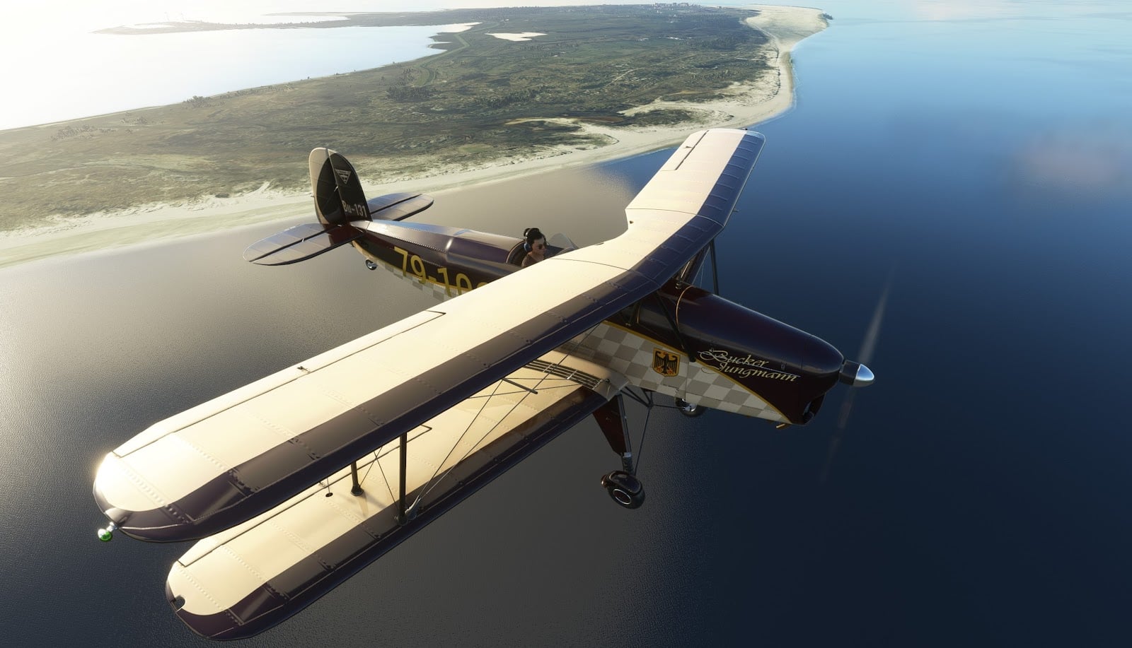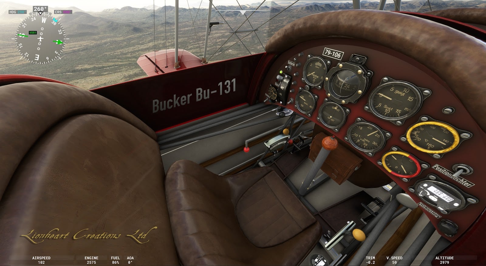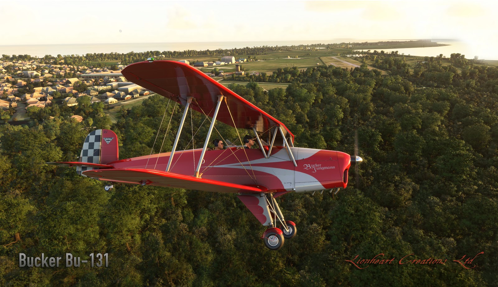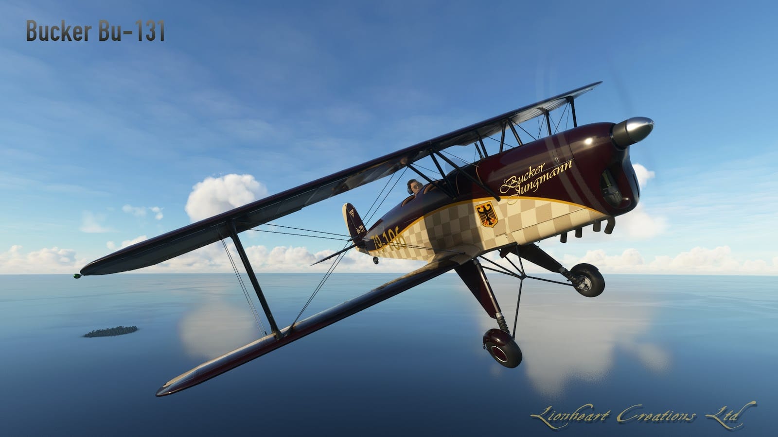 Die Bücker Bu-131 wurde von der Luftwaffe im Zweiten Weltkrieg eingesetzt und war der letzte in Deutschland gebaute Doppeldecker, von dem heute noch etwa 200 Exemplare in Privatbesitz sind. Das Flugzeug wird von einem Hirth-Motor angetrieben, welcher sich im MSFS aber leider nicht so anhören wird wie in der Realität. Lionheart Creations verwendet die Geräusche der Standard-Cessna 172. Dazu kommt der Flieger mit 14 verschiedenen Bemalungen in 4k-Auflösung und die Entwickler geben an, dass es sich um ein sehr detailliertes Modell dieses Oldtimers handelt. Im Innenraum gibt es eine große Auswahl an Lederbezügen und ein gut detailliertes Cockpit mit klassischen 3D-Instrumenten.