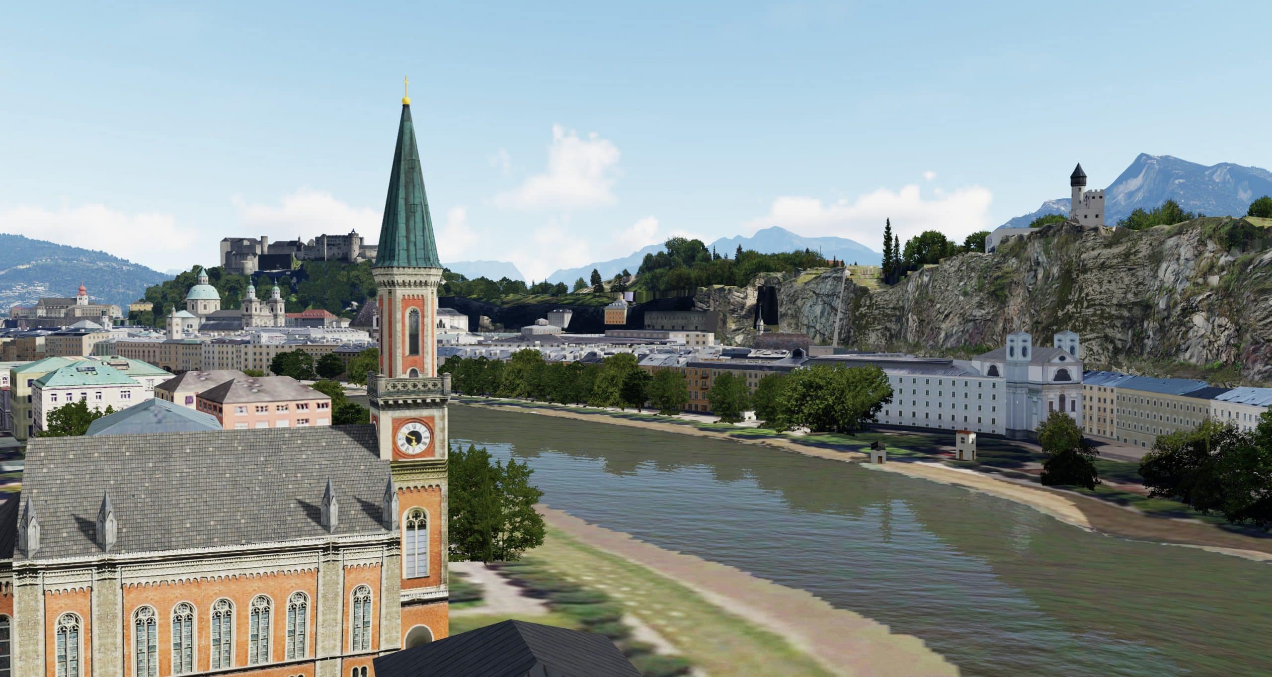 Nicht nur der drei Kilometer westlich von Salzburg gelegene Flughafen wird in der Szenerie dargestellt, sondern auch die berühmte Innenstadt der Mozart-Metropole. Die Start- und Landebahn 15/33 ist 2750m lang und bietet bei nördlichen Winden einen herausfordernden Circling Approach auf die Landebahn 33.