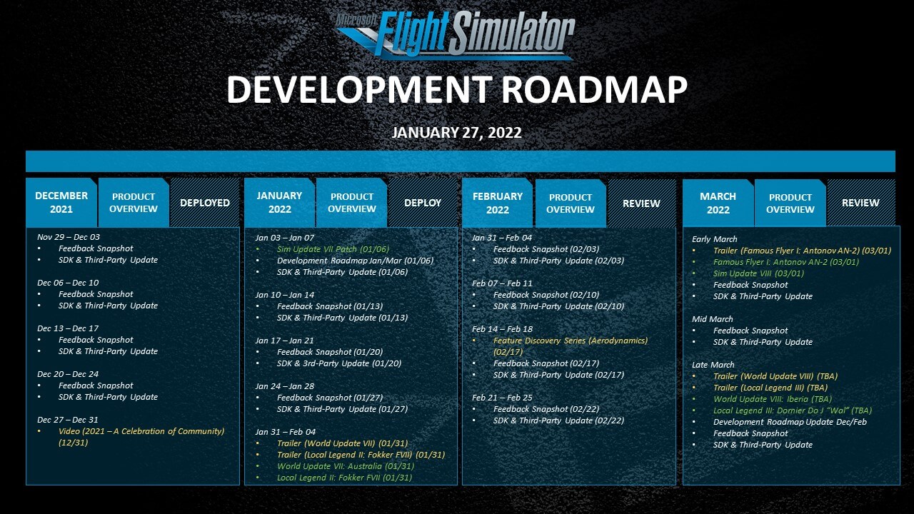 Im gestrigen Development Update im MSFS-Forum wurde auch nochmal eine aktualisierte Roadmap veröffentlicht: