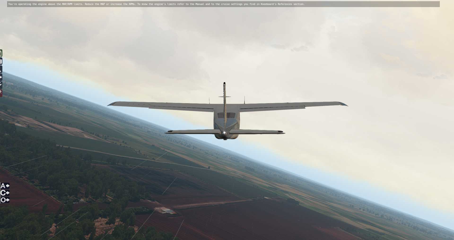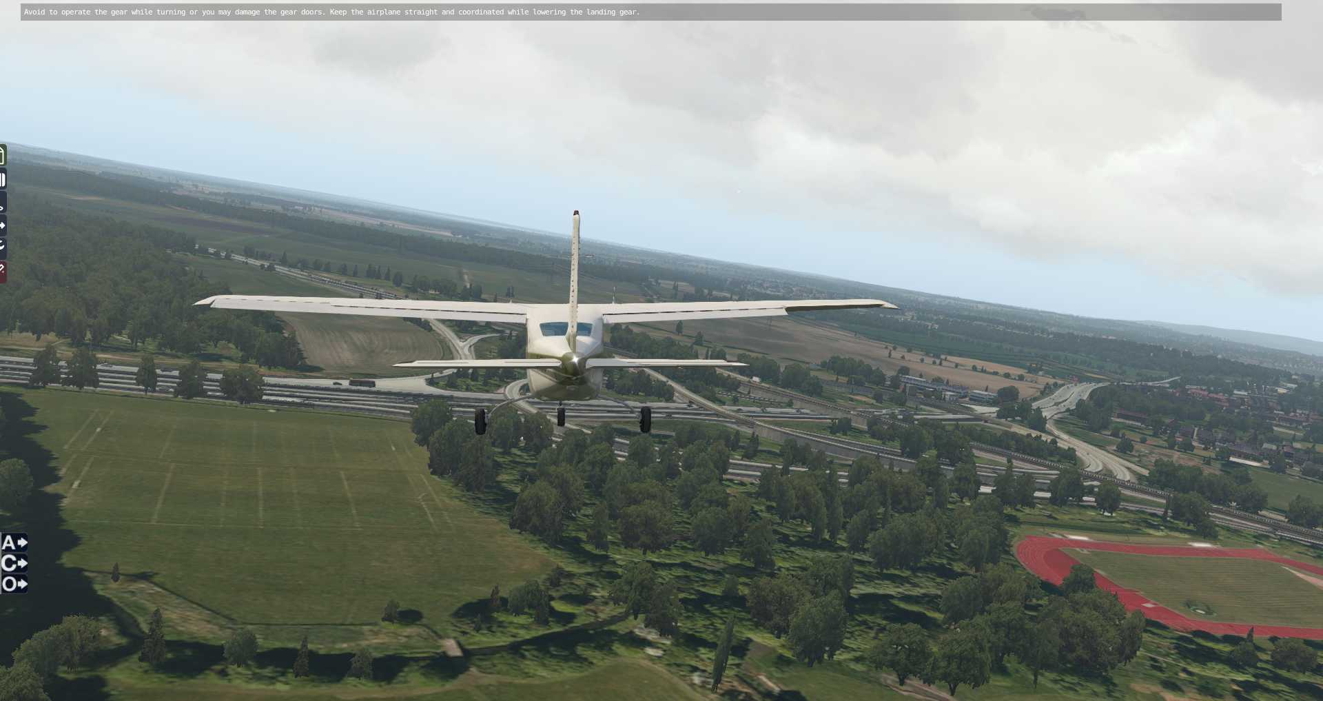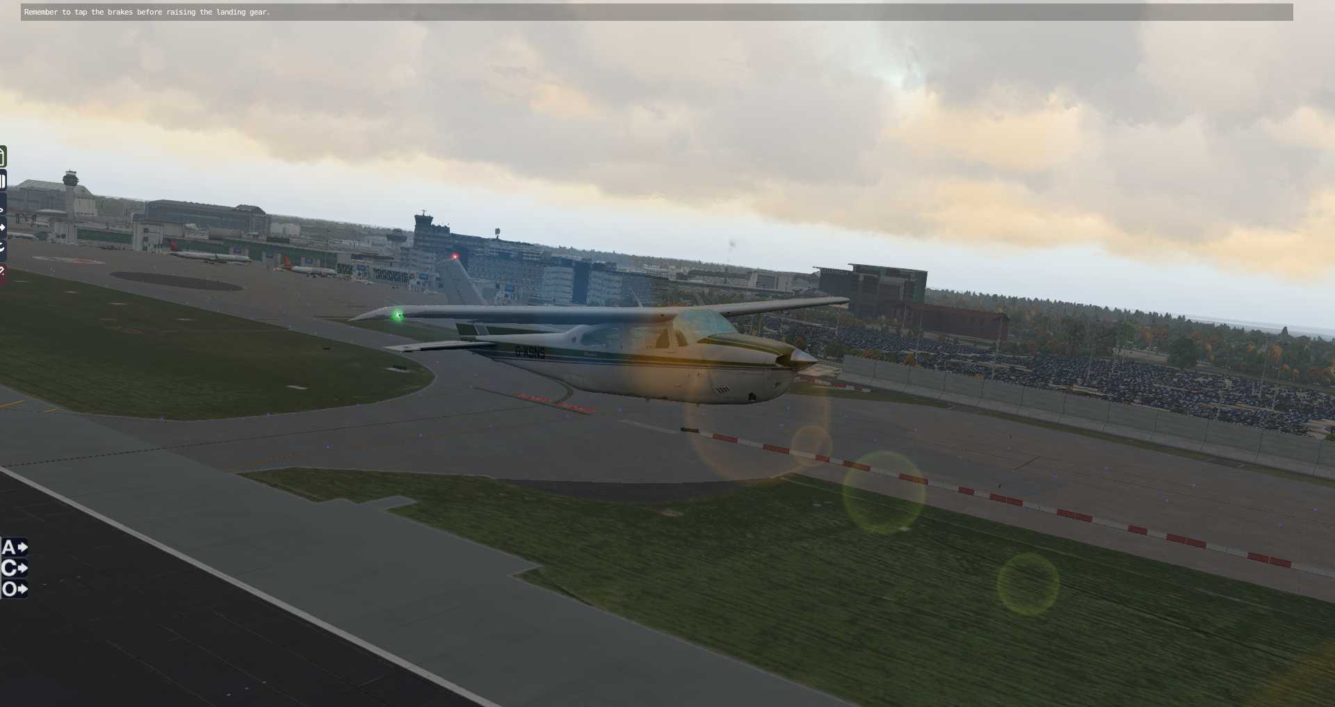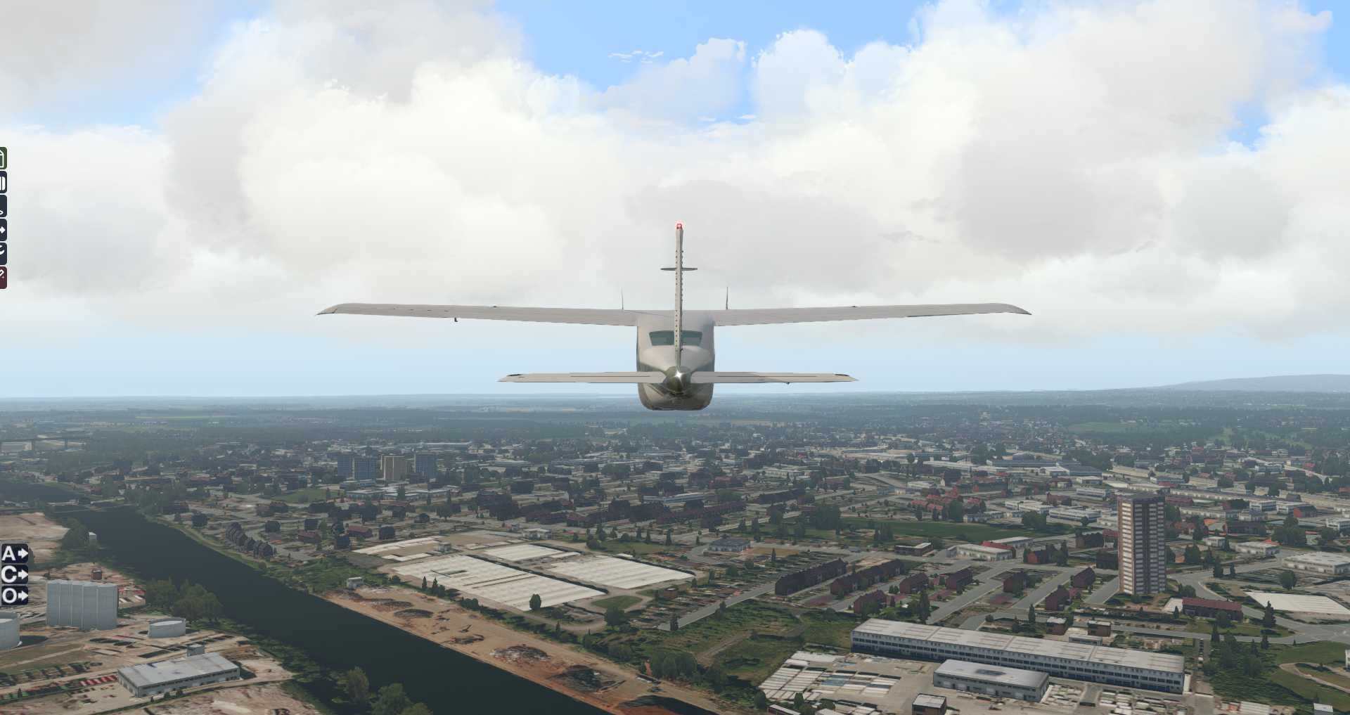 Hier erst mal der bisherige Flug als Video. Wie üblich gelten die Einschränkungen: die meisten Ruckler sind dem zeitgleichen Schießen von Standbildern zu verdanken. Auch sonst versucht das System 30 Bilder pro Sekunde zu schießen, während das System ungebunden läuft. Das kann zu Rucklern führen, wo im Simulator keine waren und umgekehrt.