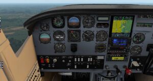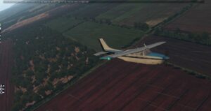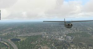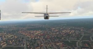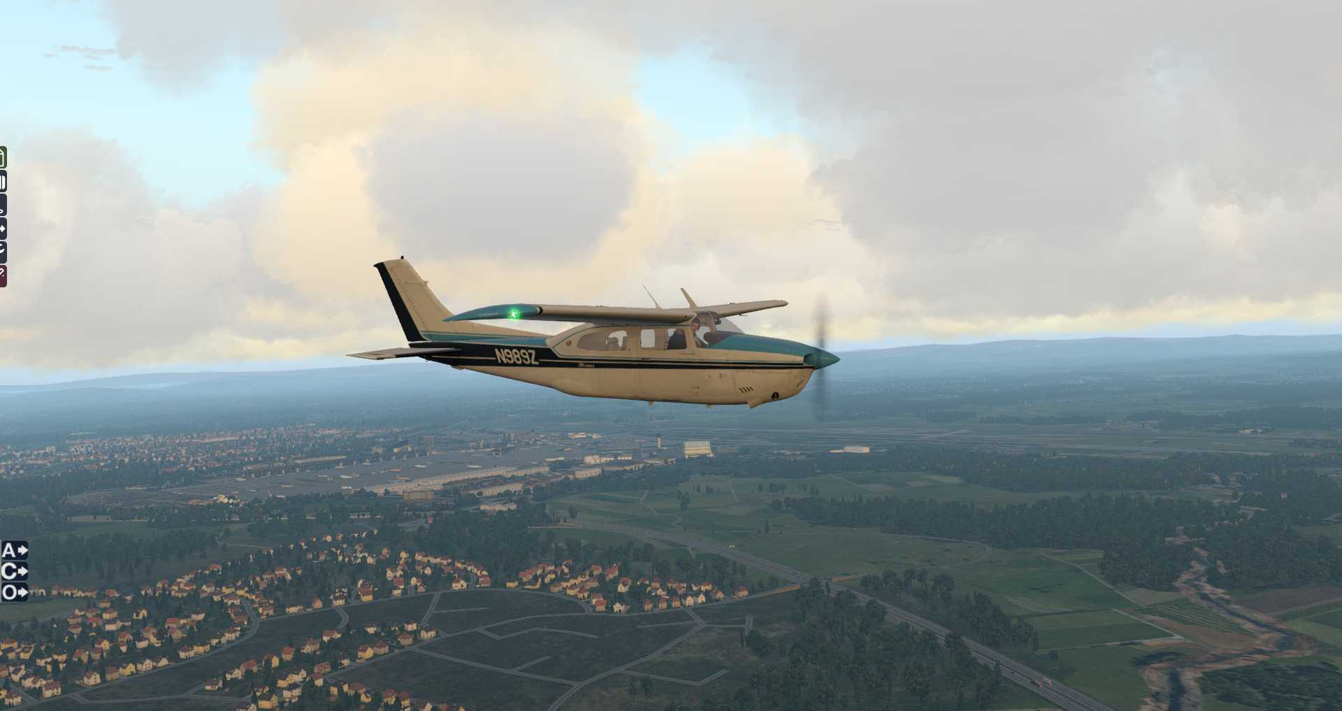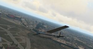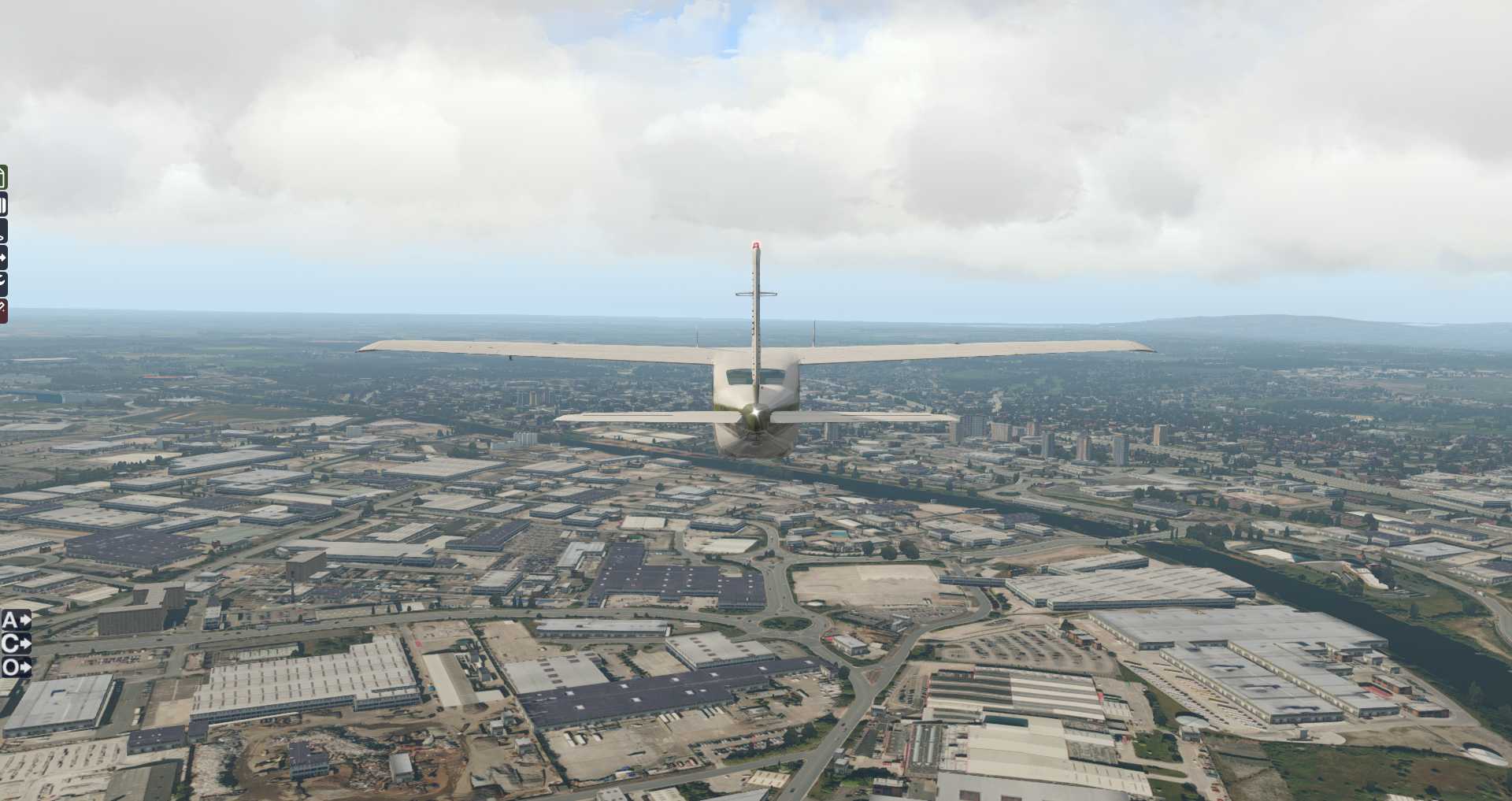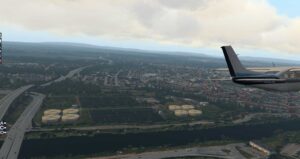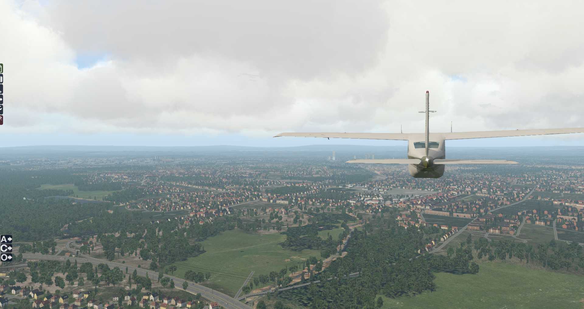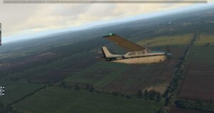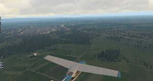 Wir sind nicht wirklich hoch und dürften in dieser Höhe fast jede Schwachstelle der Szenerie sehen können. Doch was wir sehen ist so ziemlich das Optimum, was der alte Rechner zeigen könnte. Alles wirkt soweit möglich aus einem Guss. Das Flugzeug ragt ein wenig heraus, doch das ist kein Wunder, da Laminar da noch ein paar Shader zusätzlich laufen lässt und auch mit anderen Settings.