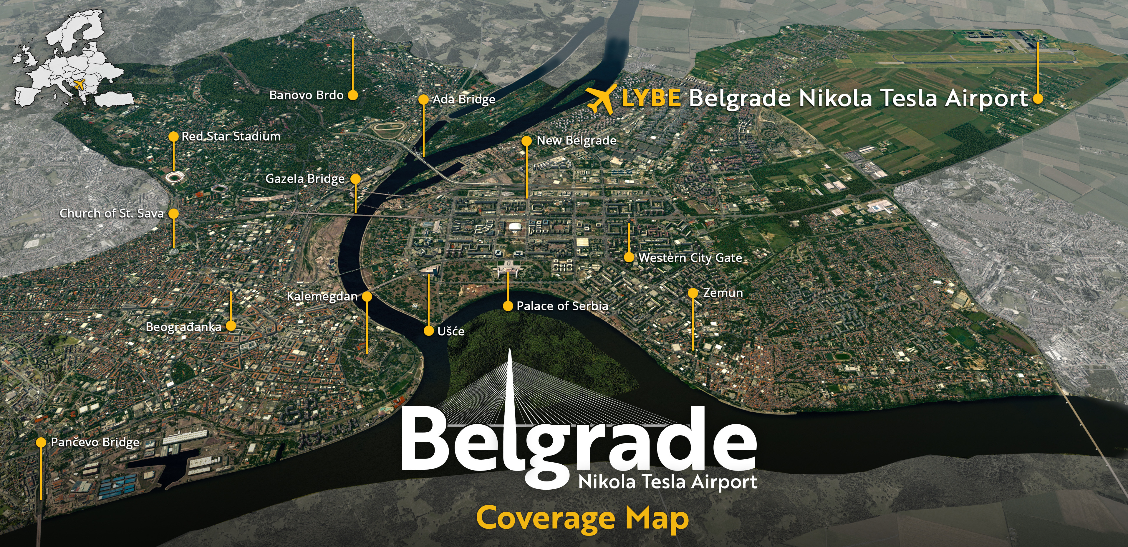 Orbx hat im hauseigenen Forum die Umsetzung des Belgrader Airports – Nikola Tesla – für P3DV4 angekündigt. Für das Projekt, welches auch den Innenstadtbereich der serbischen Hauptstadt mit umsetzt, zeichnen Misha Cajic und Rasha Tucakov verantwortlich. Misha hat schon an zahlreichen Orbx Projekten mitgewirkt und für Rasha handelt es sich hierbei um seinen Heimatairport. In der Ankündigung wird unter anderem mit der kompletten Innenumsetzung des Terminals geworben, auch habe man hundert von POIs im Stadtgebiet platziert. Es soll sich bei diesem Projekt um die aktuell detaillierteste und realistischste Stadtumsetzung im Orbx Portfolio handeln. Einen Überblick über den Umfang gibt das unten stehende Bild. Einen genauen Release Termin gibt es noch nicht, auch wird nicht angegeben ob eine X-Plane Version folgen soll.