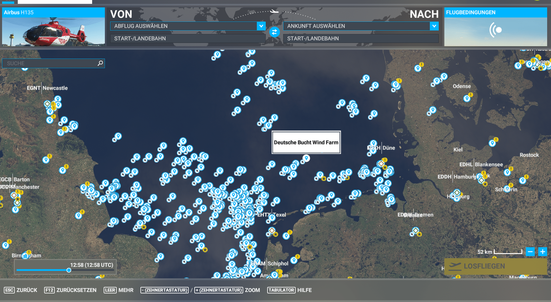 Der Blick auf die Weltkarte nach der Installation erschlägt einen schon ein wenig angesichts der schier gigantischen Menge an POIs und Startplätzen. Hunderte Plattformen stehen zur Auswahl. Das Addon hat zum Glück ein umfassendes Handbuch als PDF, bei dem die unterschiedlichen Typen der Szenerie aufgelistet sind. Man kann sehen, wo große Windparks liegen und wo größere Schiffsansammlungen zu finden sind. Vor allem aber gibt es eine tabellarische Liste der Startmöglichkeiten mit ICAO-Codes, über die sich auch Routen besser vorplanen lassen.