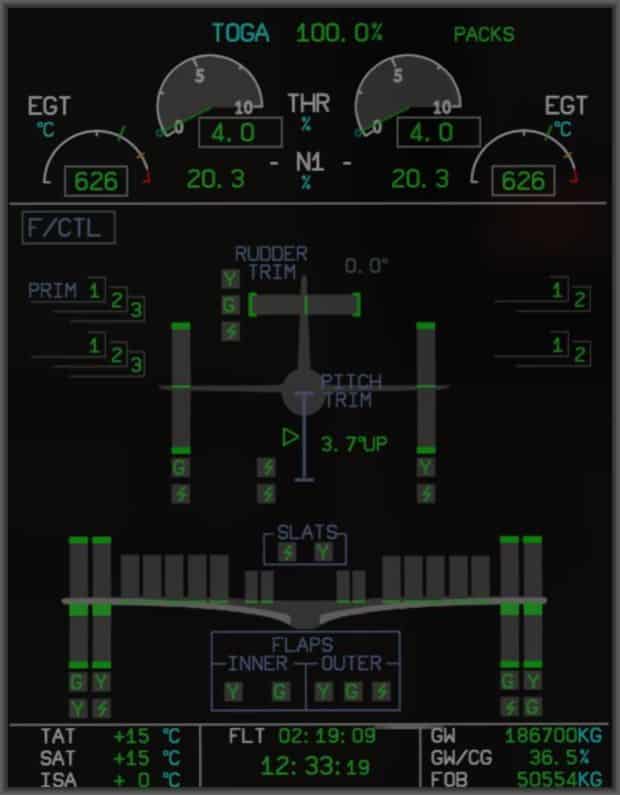 Die Thrust Lever (bei Airbus Schubhebel, nicht Gashebel(!)) verfügen über alle Airbus-Betriebsarten A/THR, FLEX, TO-GA Zonen, die auch andere Airbus Modelle aufweisen. Gestartet wird entweder im TOGA oder FLEX Modus. Ich rolle also zur Piste und rolle auch gleich auf diese auf. Sobald ich die Schubhebel auf den Betriebsmodus TOGA gesetzt habe löse ich die Bremse. Die A350 XWB beschleunigt rasch und ich rase über die Runway 32R von Toulouse-Blagnac, wobei ich hoffe, dass mir nicht wieder ein Vogelschwarm in beide Triebwerke rasselt, so wie ich es auf einem meiner Testflüge erleben musste. Beide Treibwerke fielen aus und ich stürzte mit der Maschine ab. Gott sei Dank nur im Simulator! Wie so was auf den Anzeigen im Cockpit der A350 XWB aussieht, lässt sich an der Abbildung gut erkennen. Die Warnmeldungen, die im Warn Display aufleuchten, sind dramatisch und unmissverständlich. Sie signalisieren einen kompletten Triebwerksausfall, der irreversibel ist. Die Kollision erfolgte in einer Höhe von ca. 200 Fuß. Gegenmaßnahmen, das Flugzeug zu stabilisieren, halfen hier nicht mehr weiter. Irgendwie ziemlich realistisch und auch faszinierend dargestellt. Nur erleben möchte man so was auf keinen Fall.