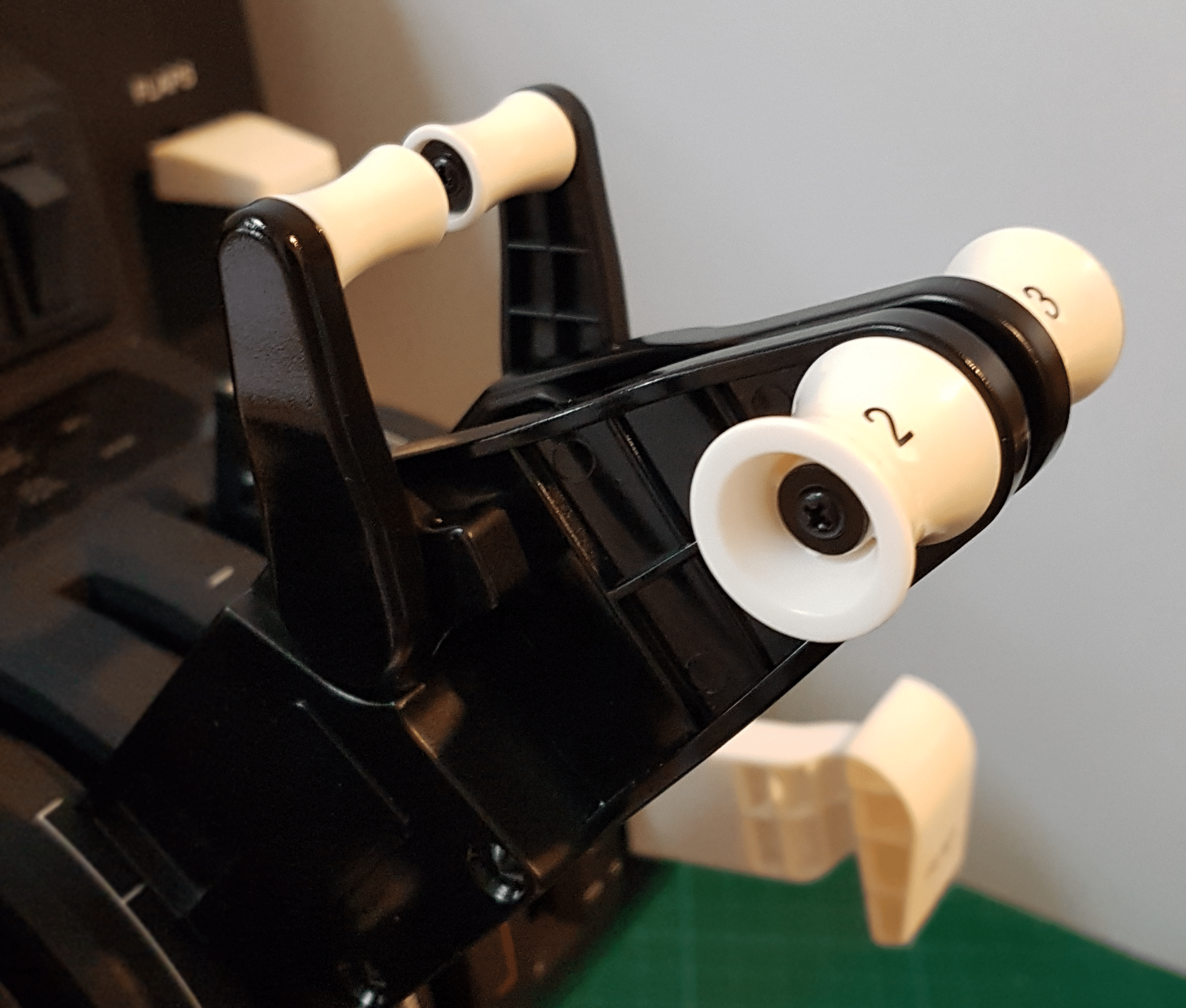 Eine große Freude bereitet mir das Trimrad, weil ich das in meinem bisherigen Setup bereits vermisst hatte, aber nie enthusiastisch genug war, mir dafür extra Hardware anzuschaffen. Eigentlich recht simpel aufgebaut, erfüllt es aber sehr gut seinen Zweck und lässt nun ein Trimmen in nie – für mich – gekannter Präzession zu. Dabei liefert das Rad nur zwei Button Inputs, also rauf oder runter. Trotzdem kann ich da durch leichte Bewegung der (im Boeing-Style schwarz/weiß) lackierten Scheibe genauer trimmen, als ich das mit den bisher zugewiesenen Joystickbuttons tun konnte. Beides ergänzt sich nun hervorragend.
